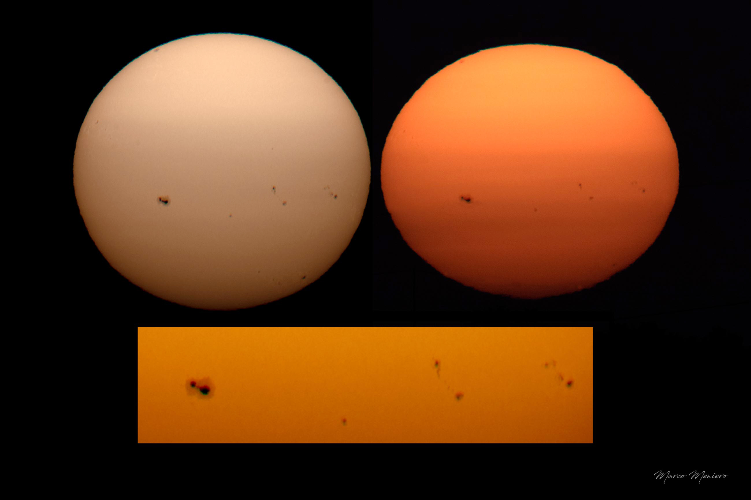 Green formations can also be observed on the lower edges of large sunspots as these are much darker than the Sun. In these cases one should not consider the green ray on the lower part of the spot, but on the upper part of the Sun below the spot. On the evening of July 11 2023 I tried to take the green ray on the large sunspot AR3363 and I succeeded. From Viterbo, Italy. In the image I propose you can see mainly four effects: The refraction that flattened the solar disk, atmospheric absorption with scattering that made the solar disk redder, the Green flash on almost all sunspots and finally the Green segment on the upper edge of the solar disk in both shots. Here are the shooting data: Nikon Z9 in APS-C mode with Nikon Z 400/4.5 plus 2X doubler (equivalent focal length of 1200mm) and exposure times of 1/32,000 f/20 at 18:35TU for the first solar disc , 1/32,000, f/11, 400Iso at 18:41TU for the second solar disk, 1/28,000 f/14 at 100Iso at 18:36TU for the enlargement of the sunspots with the green beam.