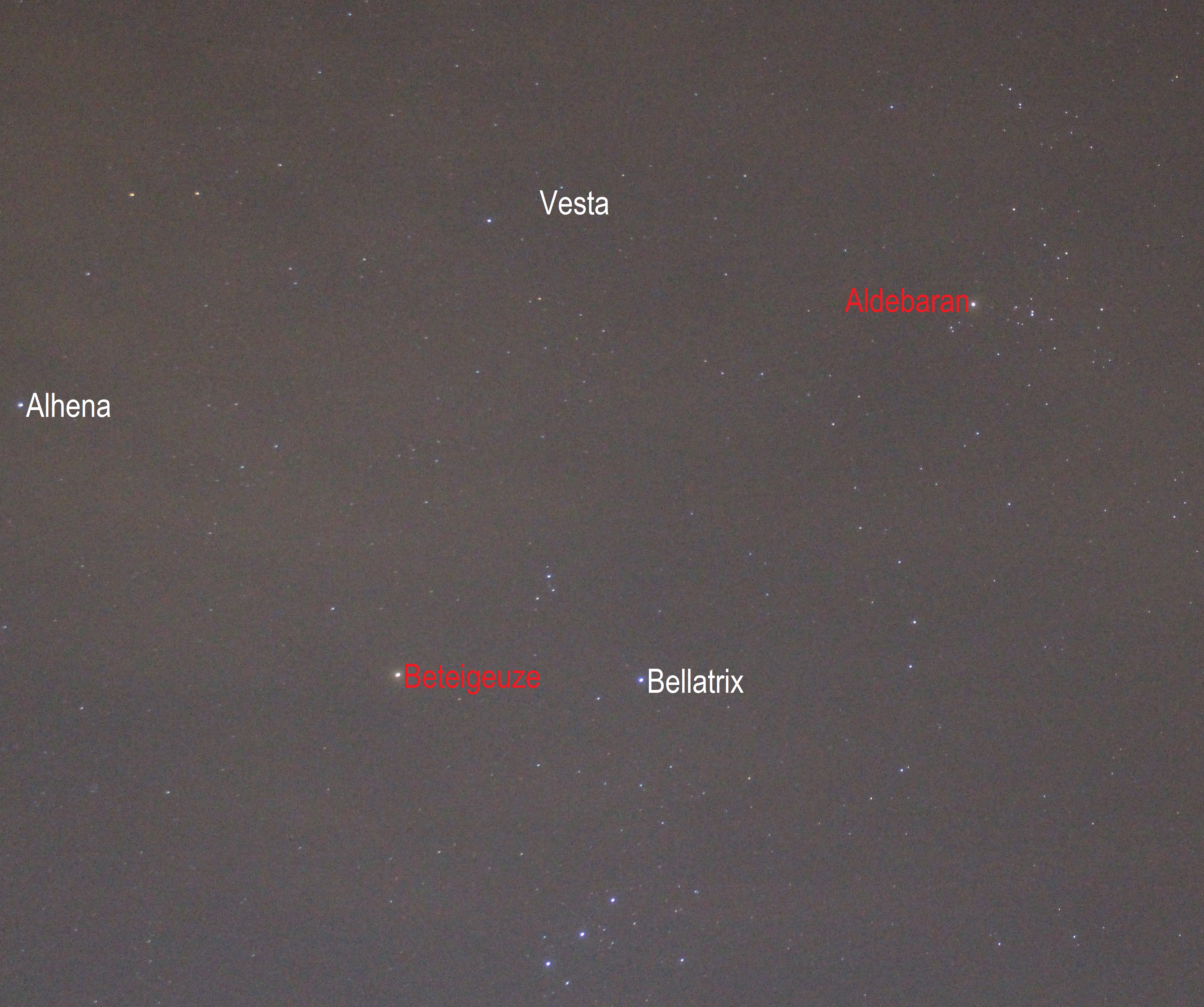 Grenzgebiet der Sternbilder Orion, Zwillinge und Stier mit dem Kleinplaneten Vesta, aufgenommen bei klirrender Kälte westlich des Sindelfinger Ortsteils Maichingen.