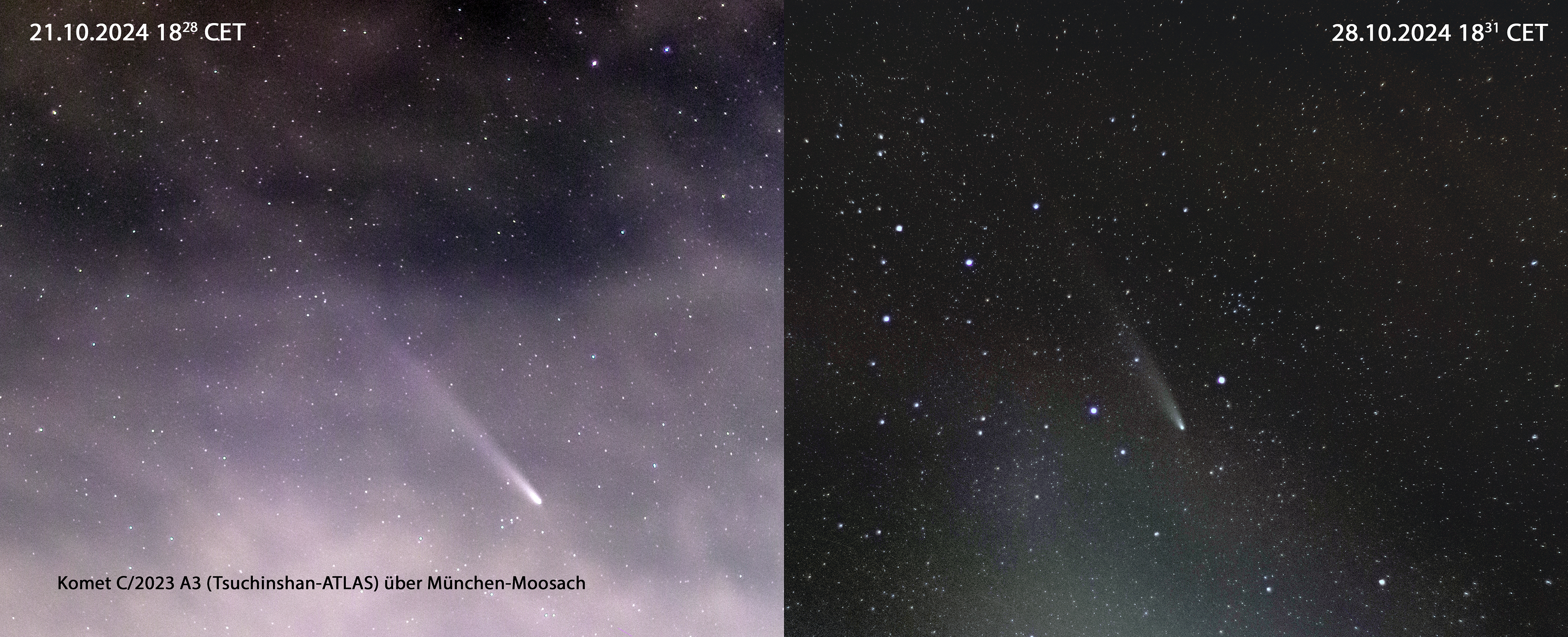 Leider ließ das Wetter in München bislang nur zwei Sichtungen des Kometen zu, und diese nur zwischen Wolken und hinter Nebelschwaden. Dies verhinderte Aufnahmen mit langer Brennweite. Der Vergleich der beiden Bilder zeigt aber, wie der KOmet innerhalb einer Woche kleiner erscheint und bald in den Tiefen des Alls verschwindet. Beide Bilder sind Stacks von 17 bzw. 40 Einzelaufnahmen.
