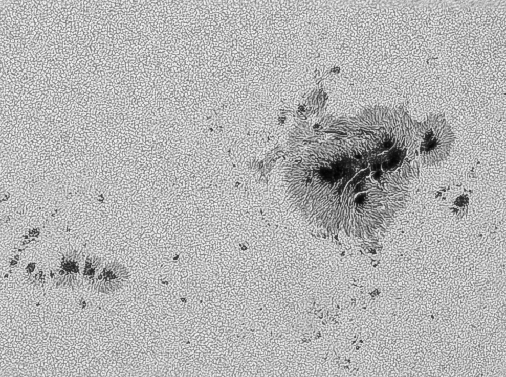 Es ist wohl der größte Sonnenfleck (mit Gruppe) in diesem Jahr: 3780. Unsere Erde würde mehrfach hineinpassen. (Photoline 130/910mm; ASI 178mm; ND3- und Baader Solar-Continuumfilter; Software/Bearbeitung: SharpCap, AutoStakkert!, Lightroom). Aufgenommen bei gutem Seeing um 8 Uhr.