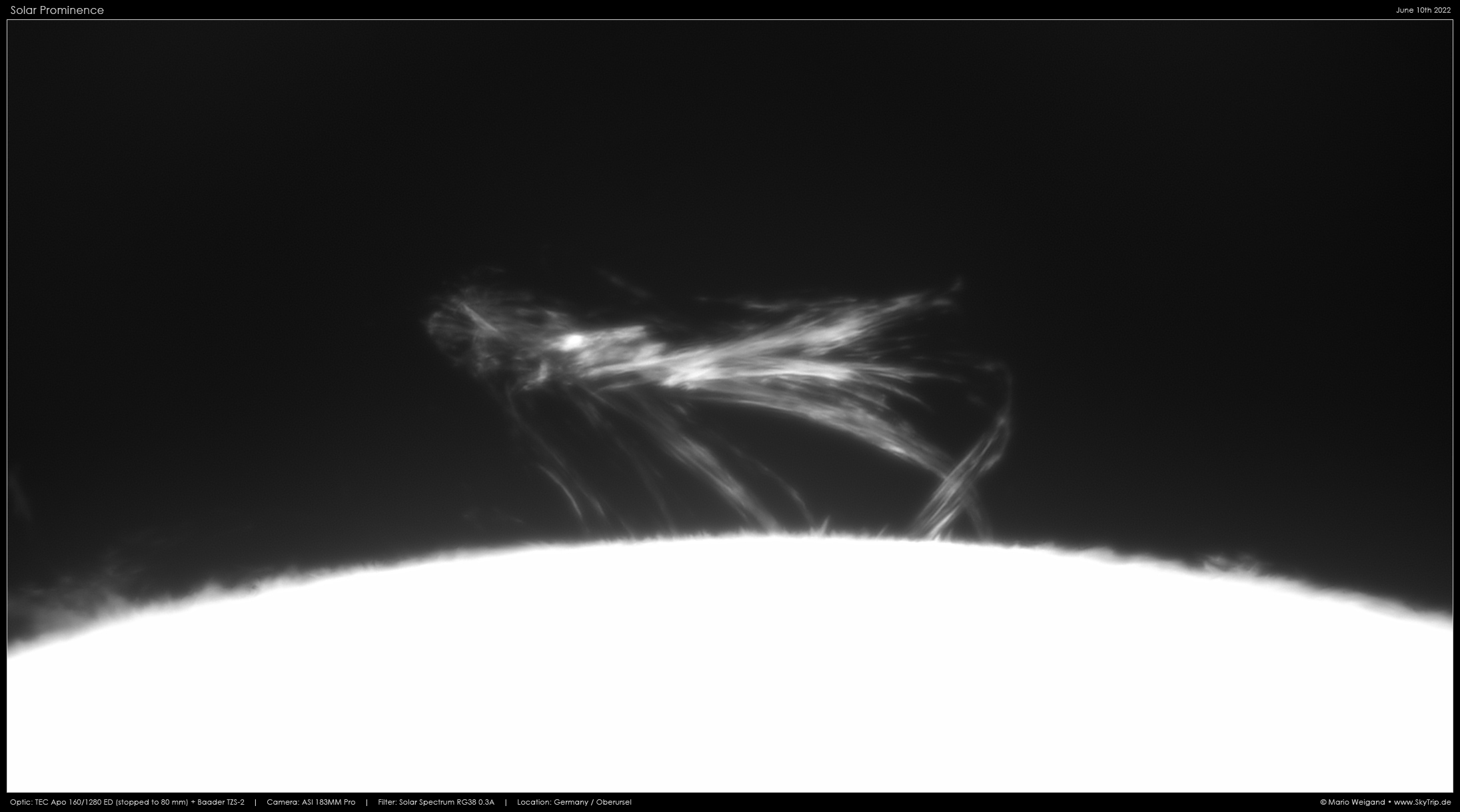 Am 10. Juni 2022 war am Ostrand der Sonne für einige Stunden eine große eruptive Protuberanz zu beobachten, deren Strukturen sich innerhalb von Minuten deutlich veränderten.