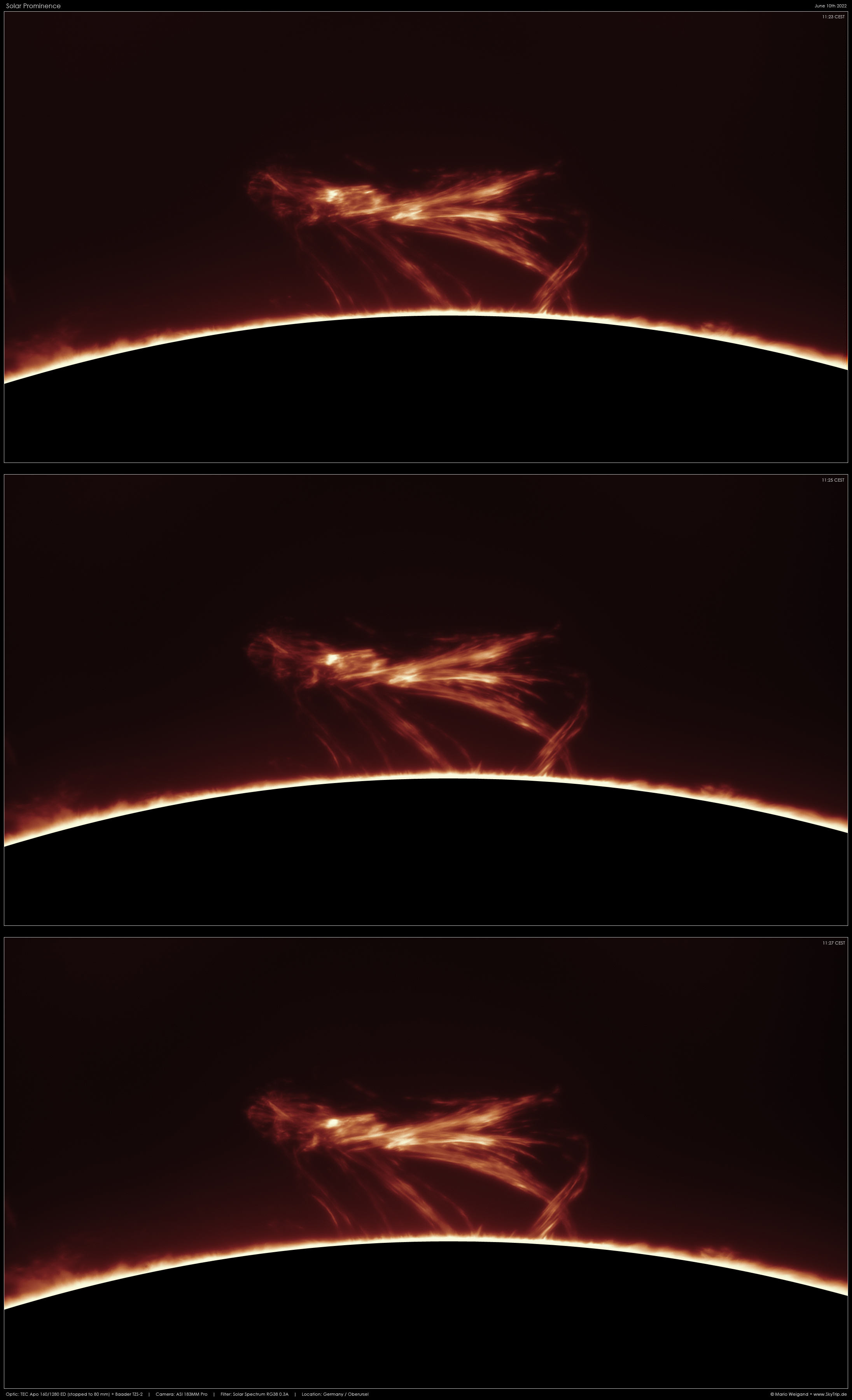 Am 10. Juni 2022 war am Ostrand der Sonne für einige Stunden eine große eruptive Protuberanz zu beobachten, deren Strukturen sich innerhalb von Minuten deutlich veränderten.
