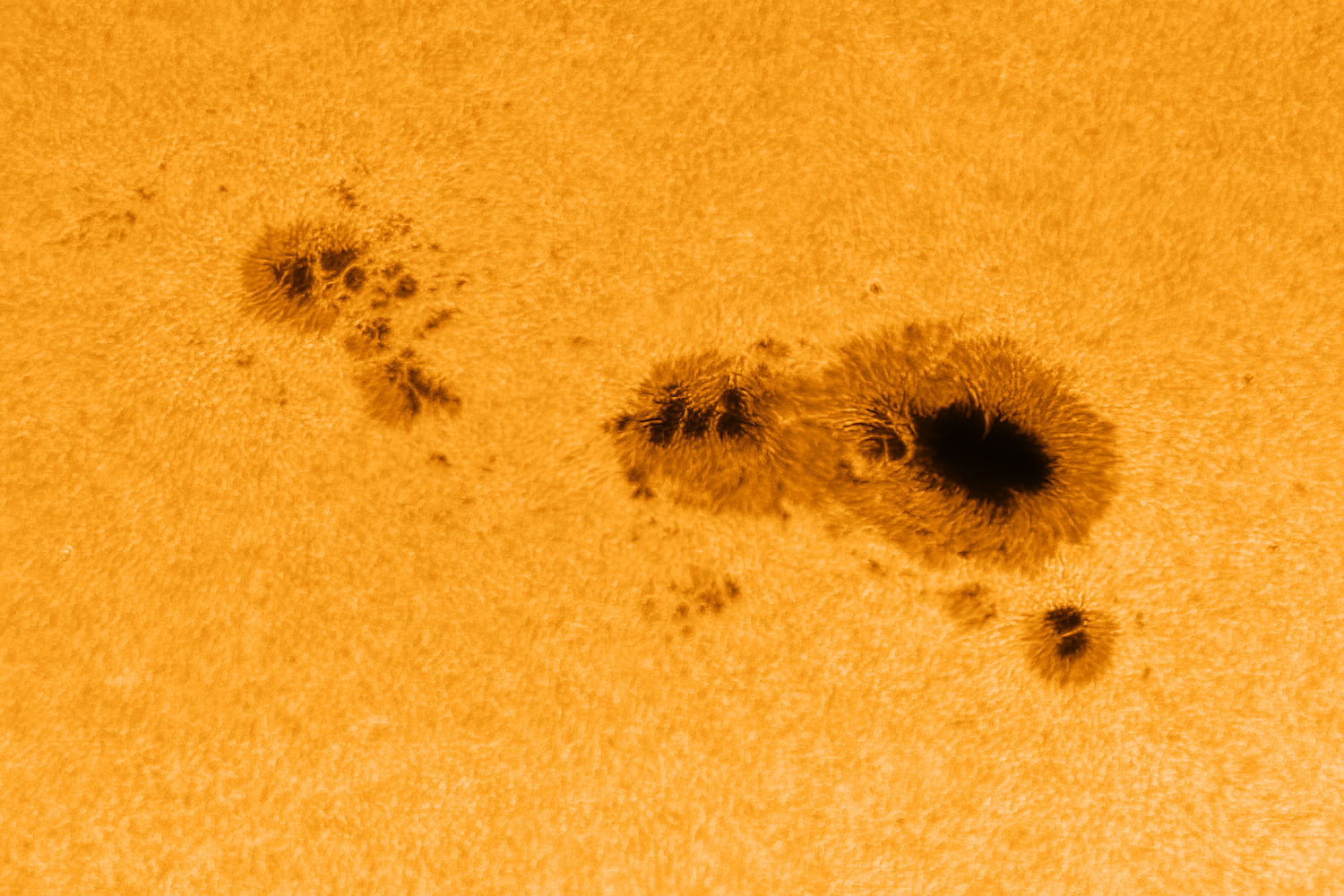 Seit dem Hereindrehen dieser spektakulären Fleckengruppe am Montag ist der Himmel in meiner Region bewölkt. Da es keinen Sinn machte die H-Alpha-Ausrüstung einzusetzen, habe ich es heute nur mit dem Herschelkeil durch die dünne Wolkenschicht probiert.