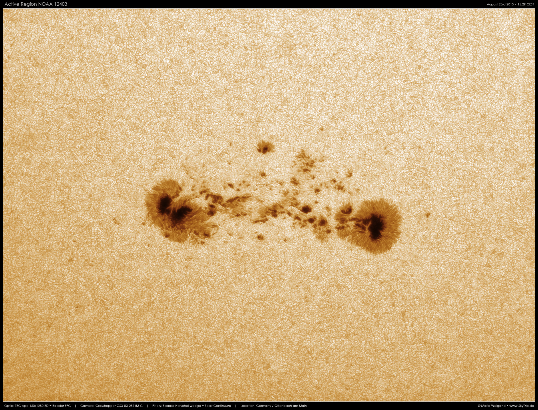 Leserbilder Astronomie: Große Fleckengruppe NOAA 12403 im Weißlicht (koloriert)