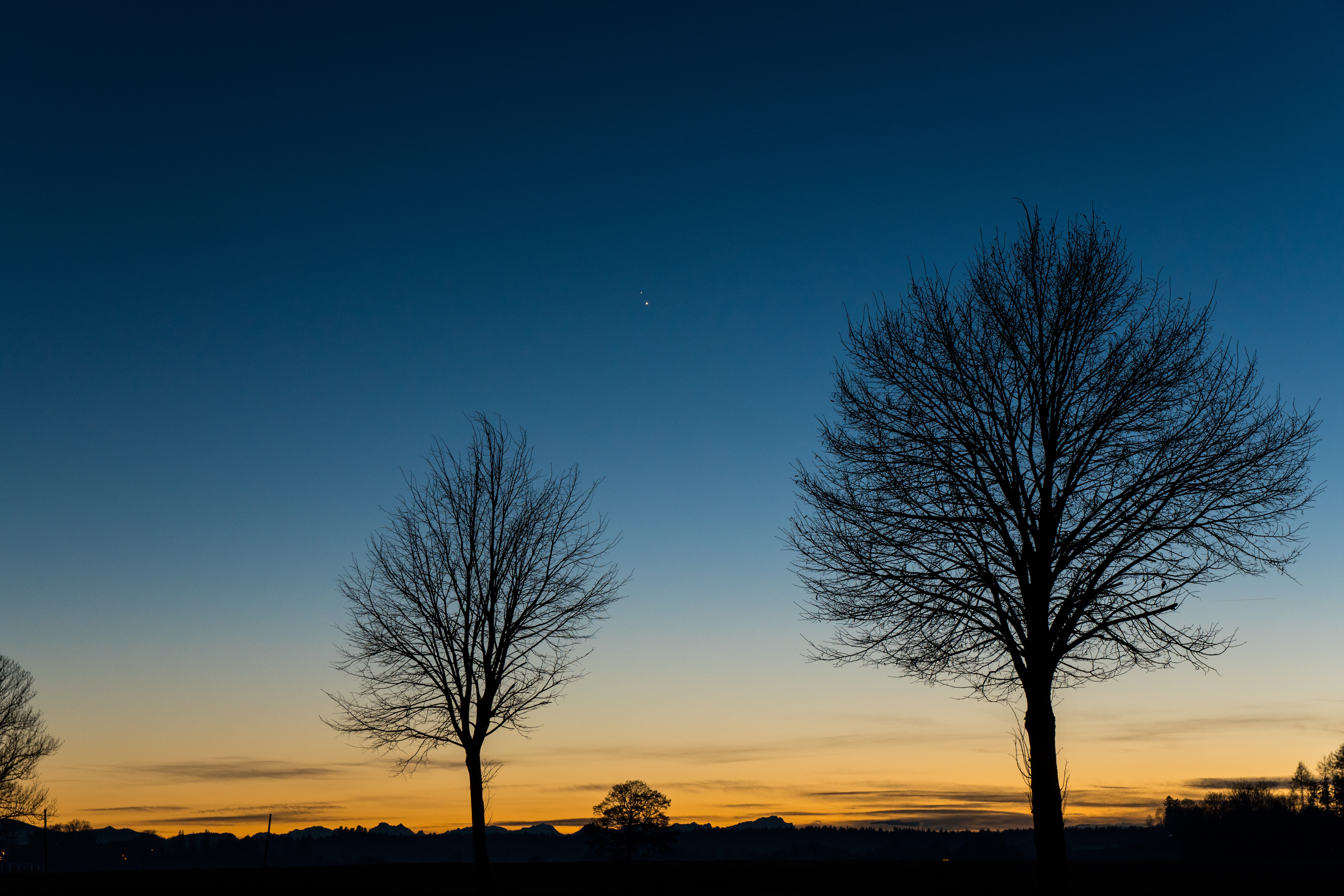 Kurz vor Weihnachten, am 19. Dezember 2020, tat sich im Süden Bayerns ein größeres wolkenfreies Gebiet auf, und ich konnte die große Konjunktion von Jupiter und Saturn vor der schönen Alpenkulisse ablichten. An diesem Abend waren es nur noch zwei Tage bis zur geringsten Annäherung der beiden Planeten.