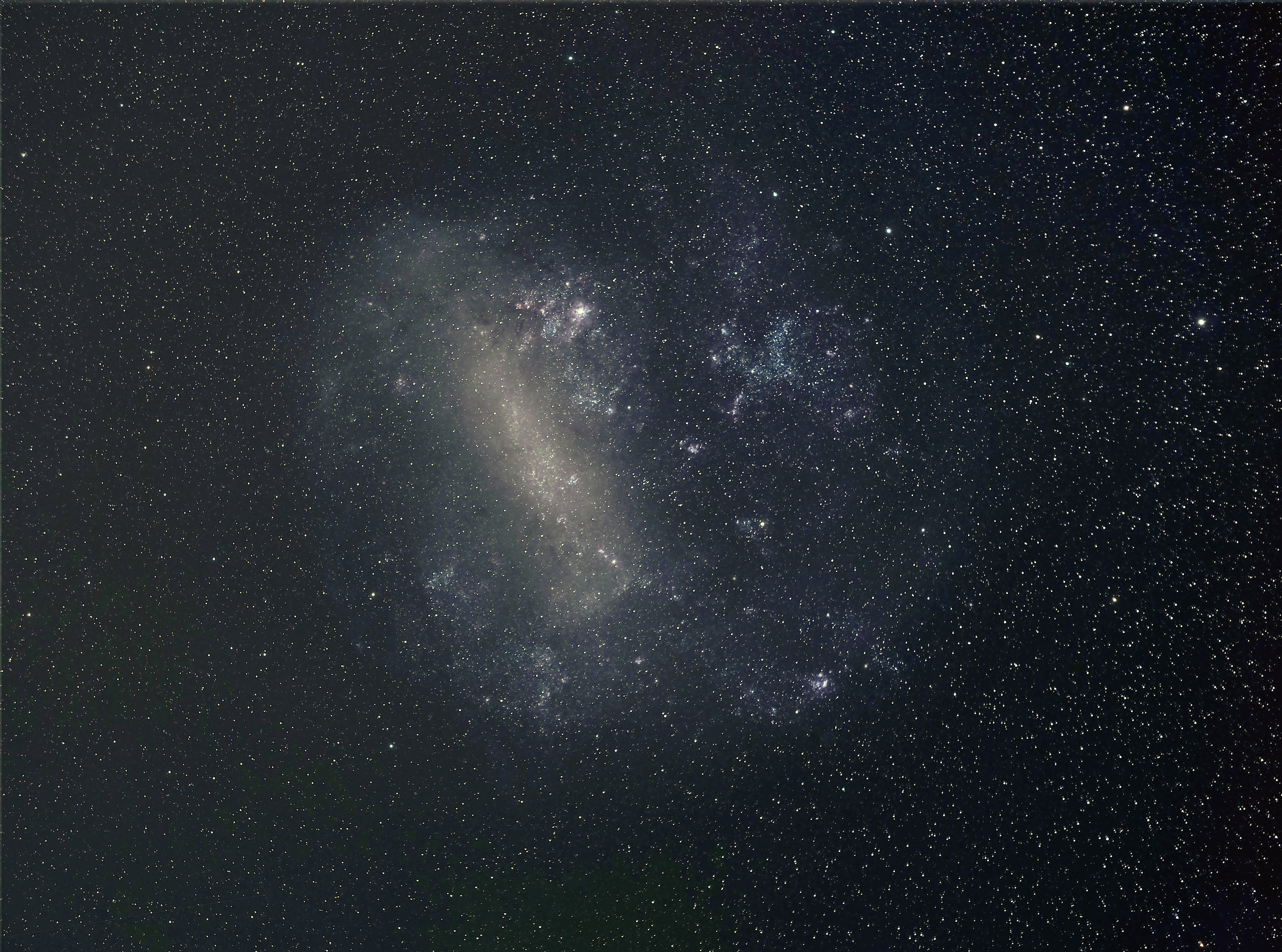 In den staubtrockenen Voranden oberhalb von Arica (Nordchile) auf 3100 m Höhe konnte ich einen dunklen Standort finden, den Pucara oberhalb von Socoroma. Leider bereitete eine Warmfront eine etwas dunstige Nacht, sodass auf den 7 x 10 Grad großen Feldern, vor alle bei dieser Aufnahme, ein schwierig zu maskierender Helligkeits- und Transparenzgradient blieb. Dennoch ist die Auflösung sehr befriedigend, man kann die Arme des Tarantelnebels erkennen, wenn man in das Bild hineinzoomt.