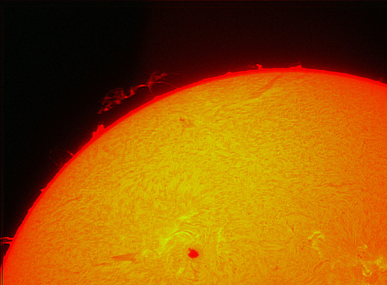 Am 16. November gab der Hochnebel dann doch die Sonne weitgehend frei. Das gab die Gelegenheit diese schöne Protuberanz aufzunehmen. Es ist immer wieder erstaunlich, was mit einem kleinen 40-mm-PST doch noch geht. Man beachte auch die im Vergleich zu der großen Protuberanz etwas unscheinbare Bogenprotuberanz links daneben.