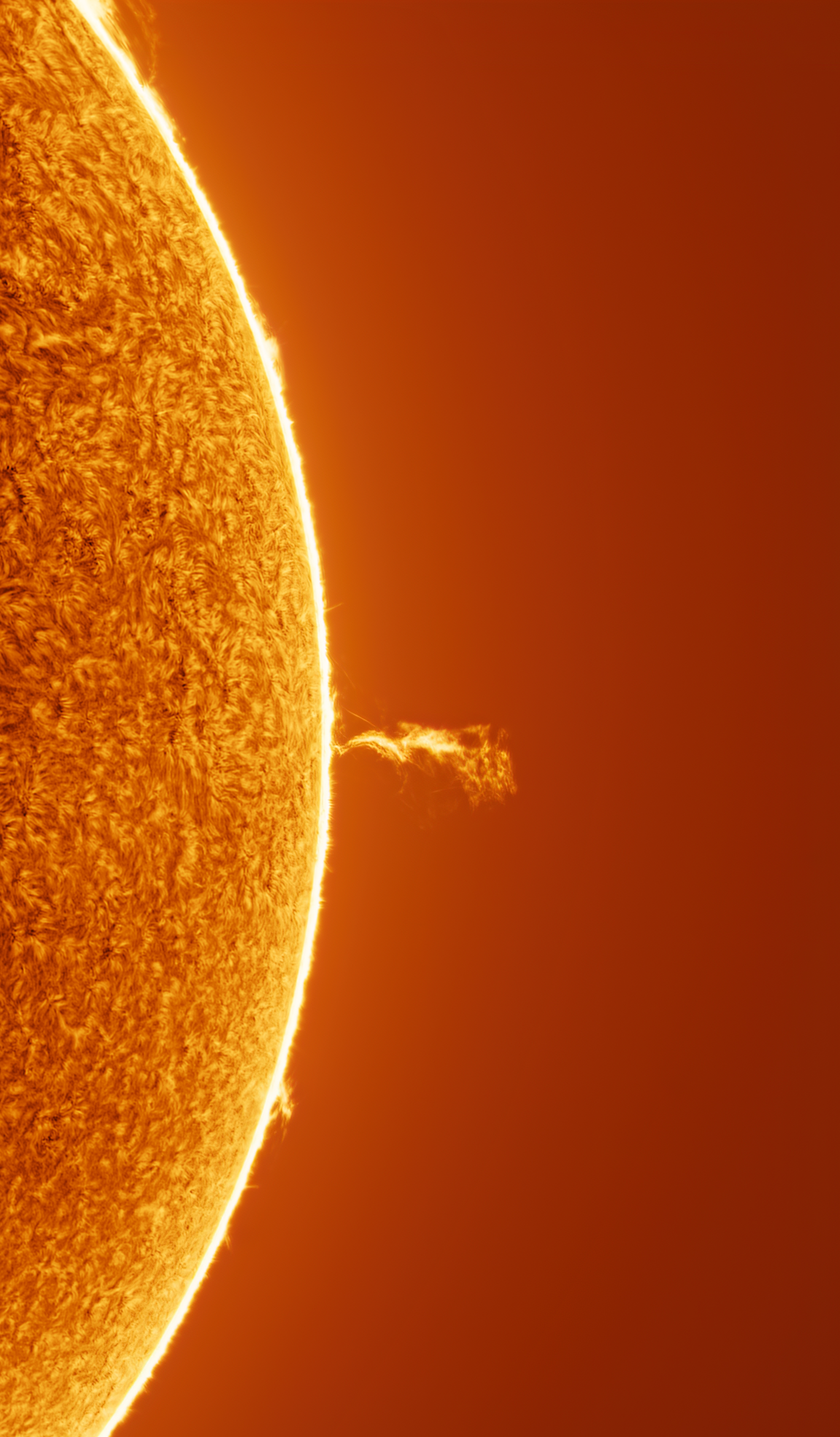 Ein H-alpha-Sonnenteleskop zeigt die untere Atmosphäre der Sonne, die so genannte Chromosphäre. Dieses Bild zeigt diese atmosphärische Schicht der Sonne mit einer Sonnenprotuberanz, einer hellen, flammenartigen Protuberanz von heißem Plasma, das aus der Sonnenoberfläche aufsteigt. Die helle und detaillierte Sonnenstruktur ist sichtbar, mit komplizierten, wirbelnden Mustern auf der Sonnenoberfläche, dem so genannten chromosphärischen Netzwerk. Die Protuberanz erstreckt sich bis zu einer Höhe von 110 000 Kilometer!