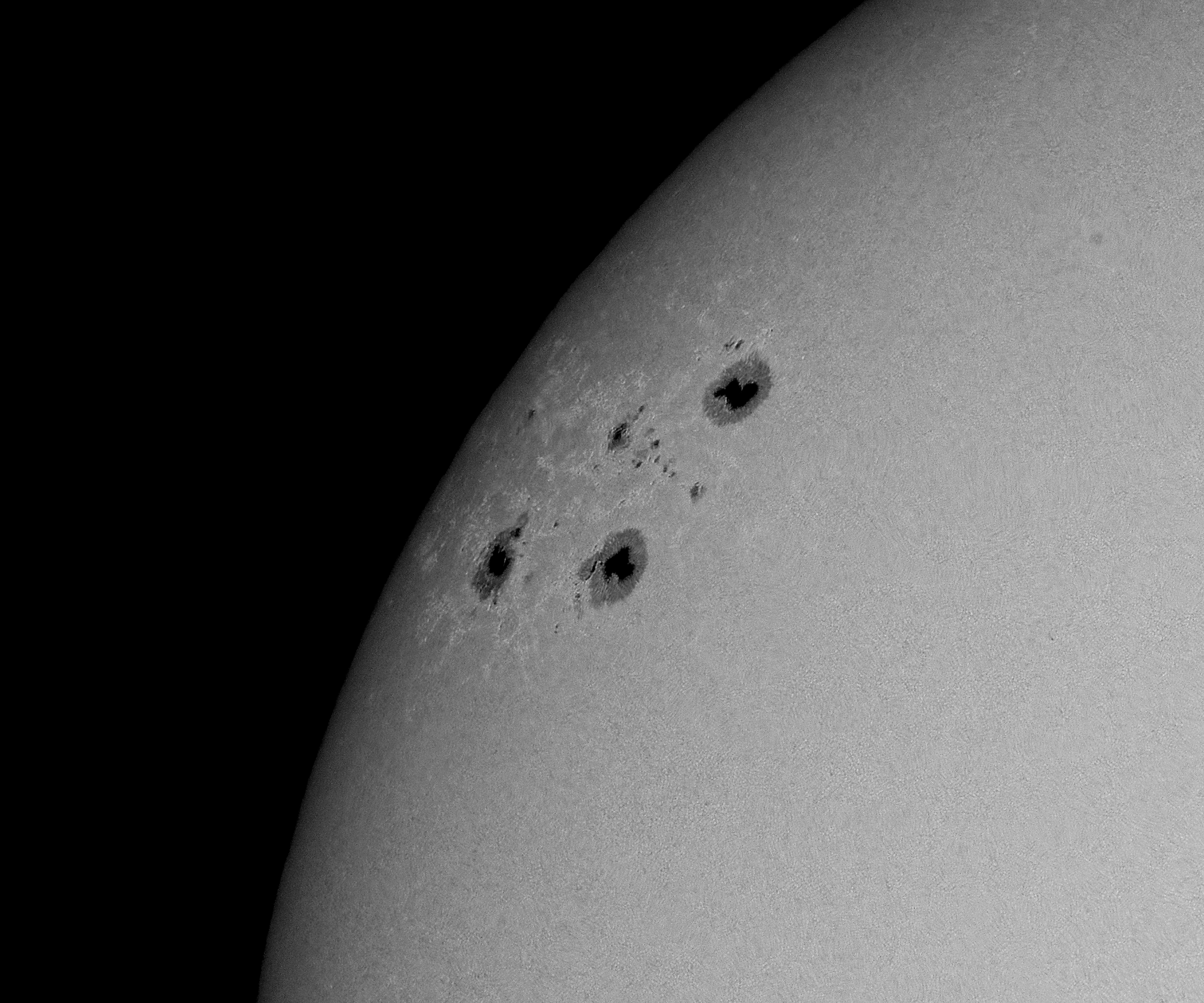 Hier sieht man die AR 12993 und AR 12994 wie sie, eingebettet in photosphärische Fackelgebiete, am Sonnenrand auftaucht. Es ist immer wieder beeindruckend, solch detailreiche Aktivitätsgebiete beim Übergang auf die sichtbare Sonnenseite zu beobachten.