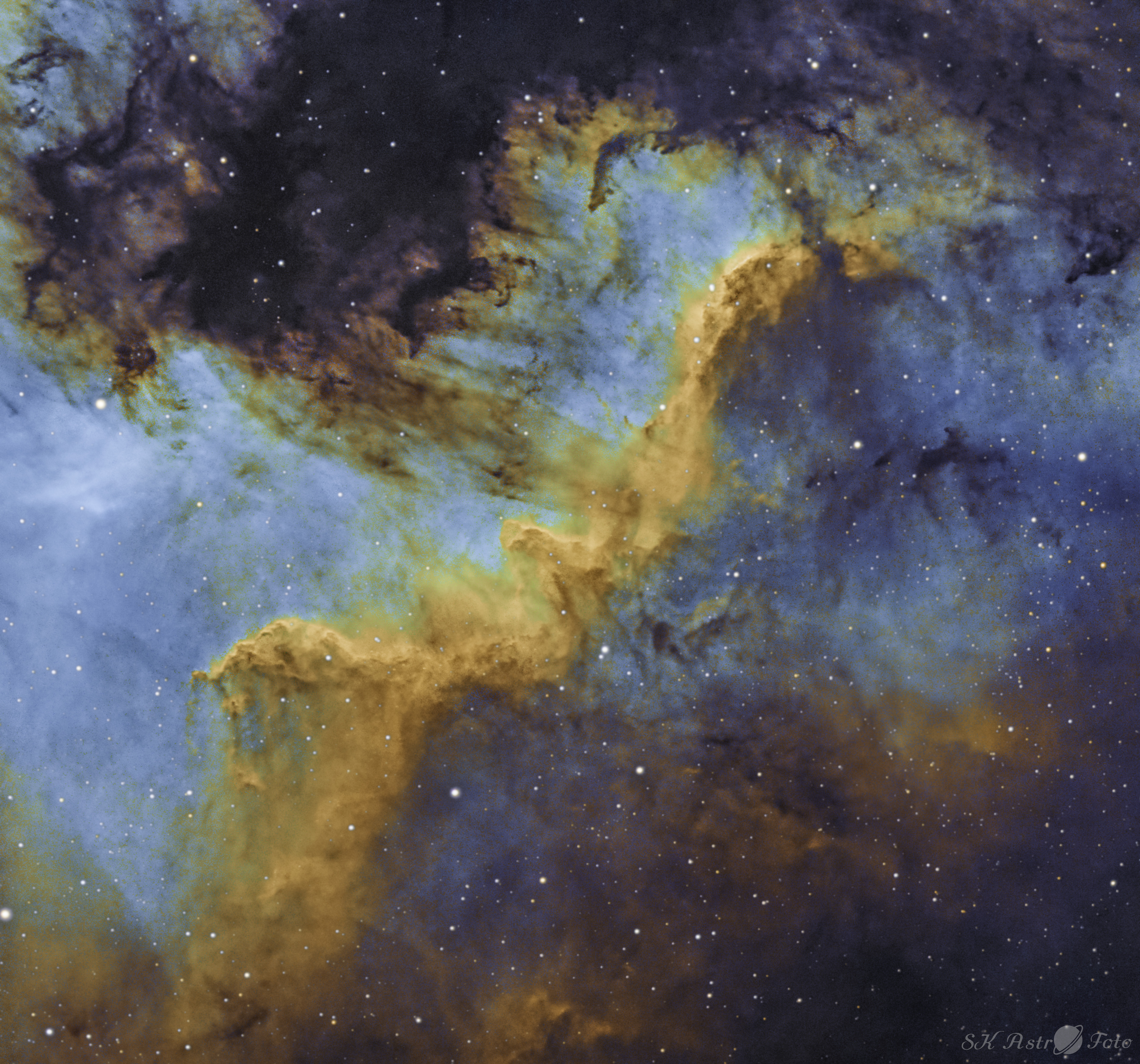 Die Große Wand im Nordamerikanebel, einem diffusen Gasnebel im Sternbild Schwan, etwa 2000 bis 3000 Lichtjahre von uns entfernt. Das Bild besteht aus 60 Einzelaufnahmen á 420 sec mit Schmalbandfilter.