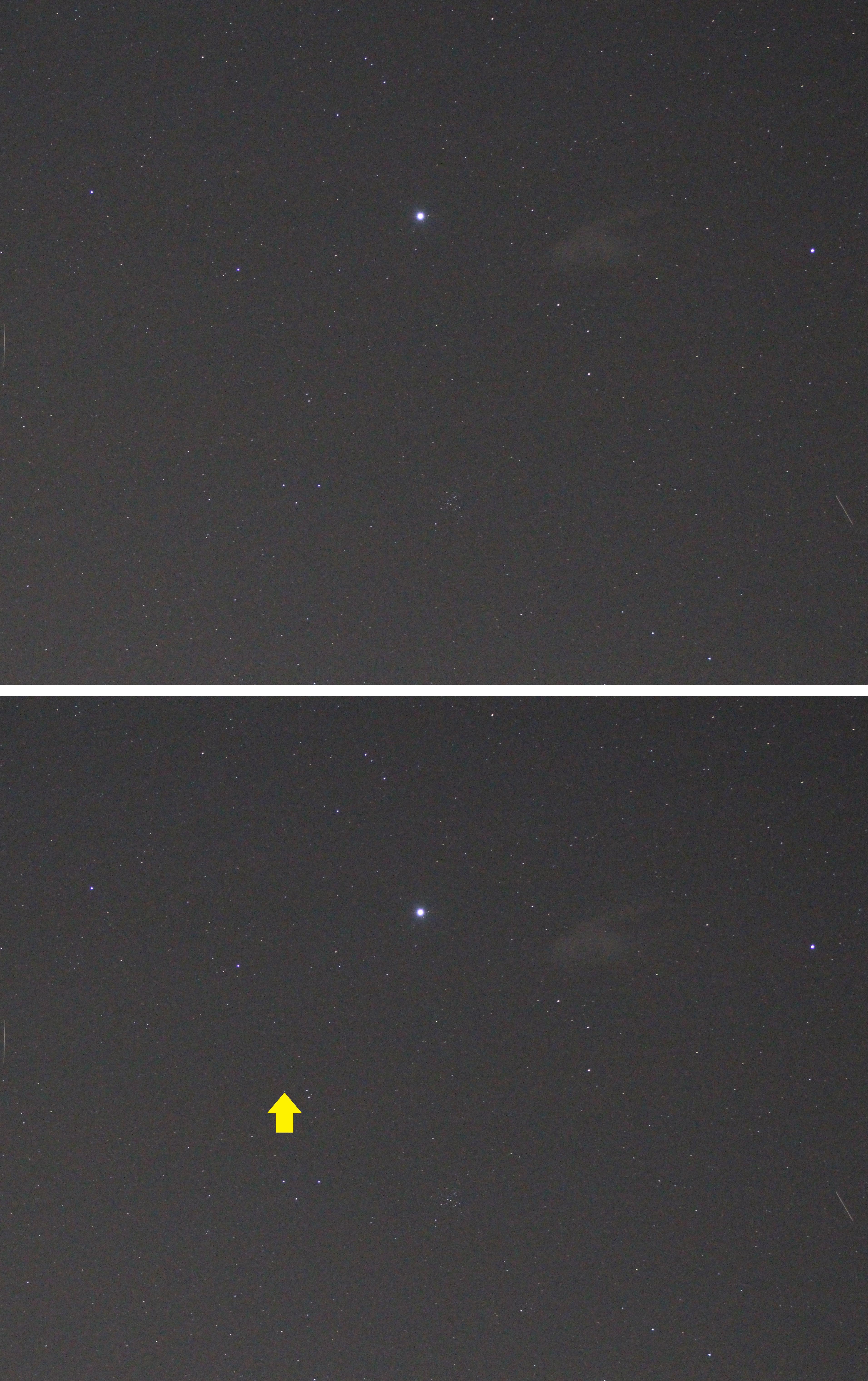 Nördliche Gebiete des Großen Hunds mit dem Kleinplaneten Pallas, fotografiert am Morgen des 18. Oktober 2022. Auf dem unteren Bild, das zur gleichen Zeit mit den gleichen Belichtungsparametern wie das obere Bild aufgenommen wurde und das auch den gleichen Himmelsausschnitt zeigt, ist der Asteroid Pallas mit einem gelben Pfeil markiert.