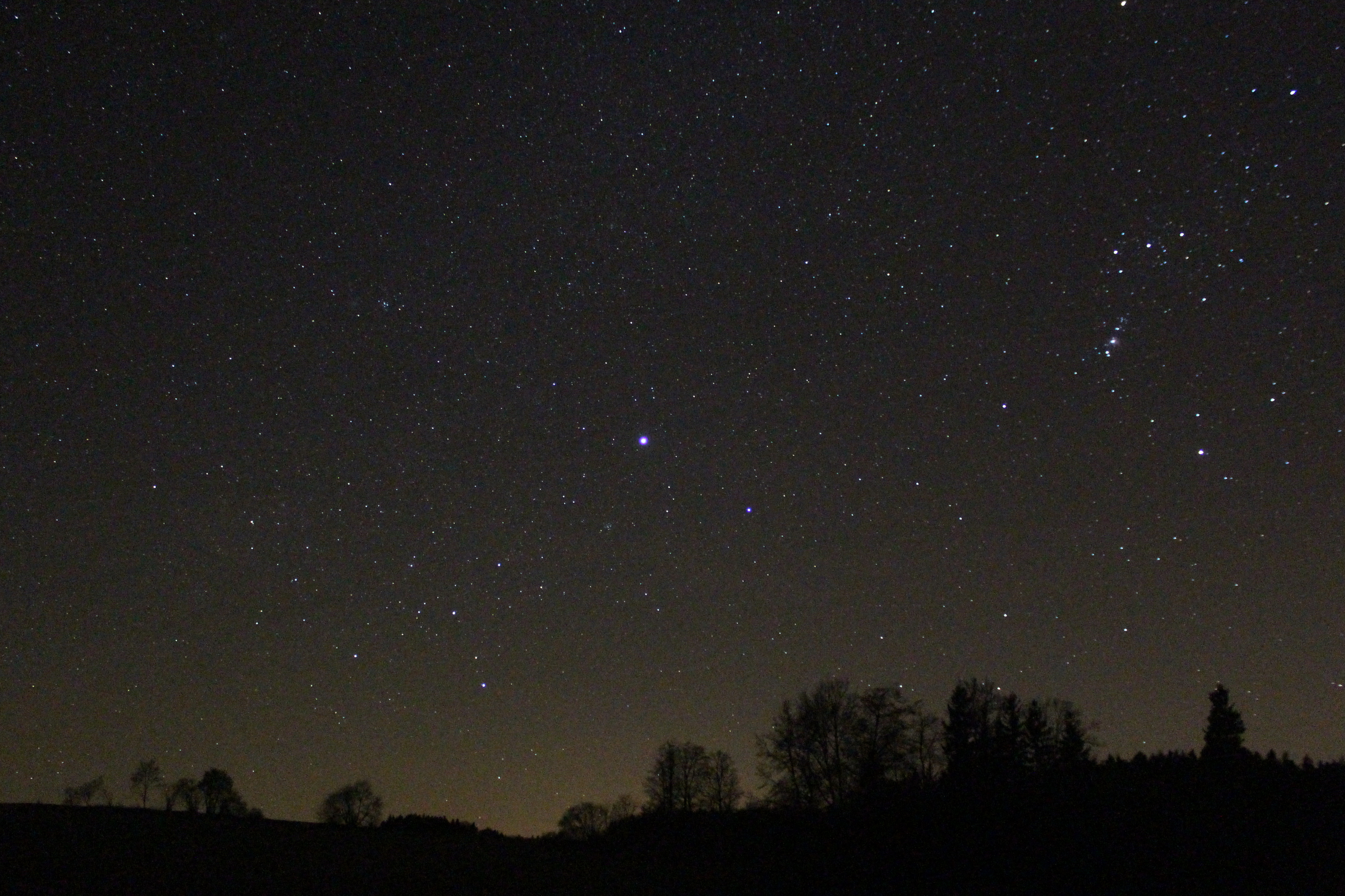 Großer Hund und Orion, aufgenommen von einem Parkplatz südlich von Engstingen auf der Schwäbischen Alb. Man erkennt deutlich den offenen Sternhaufen Messier 41.