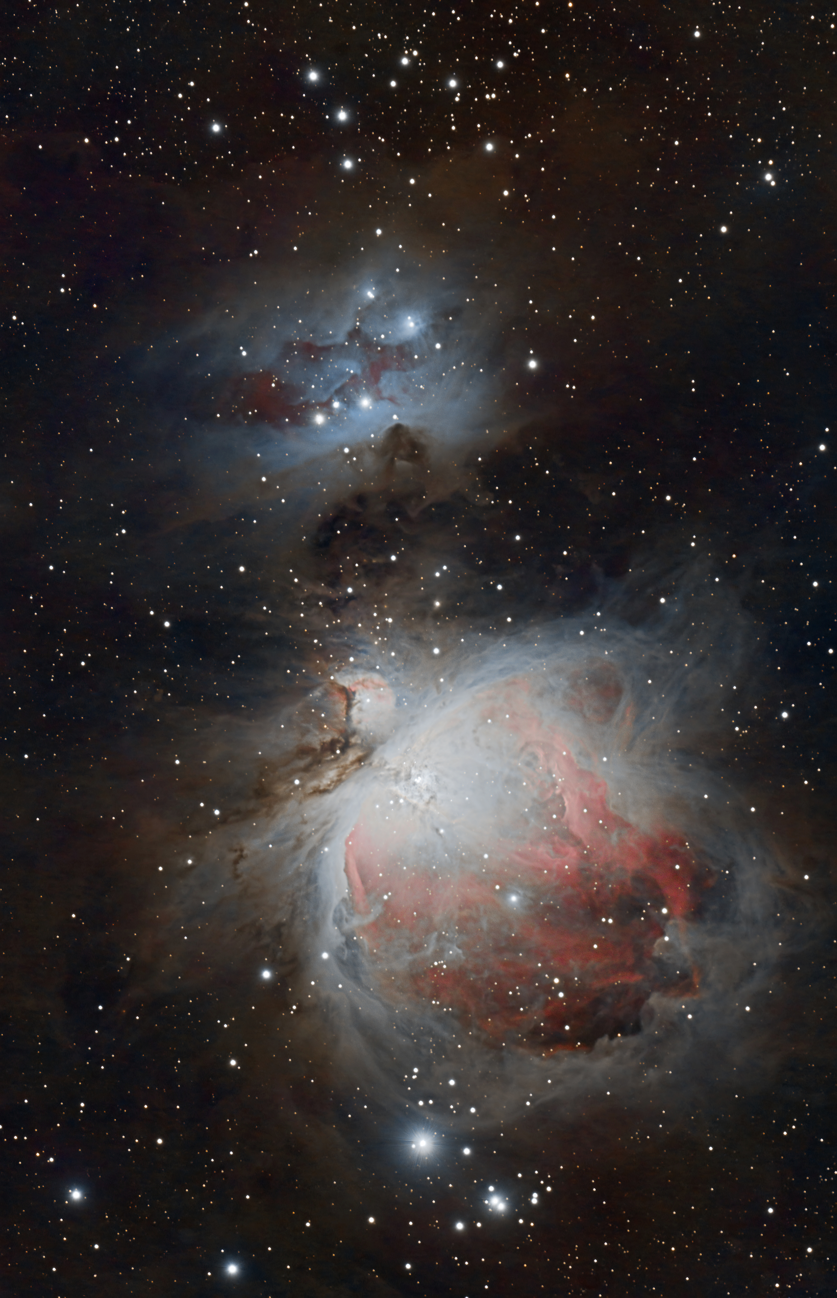 Der "Große Orionnebel" (M42/43), der offene Sternhaufen NGC 1981 und der "Running Man" (NGC 1977 im Sternbild Orion. Bei strengen Minusgraden und einem entsetzlich hellen Himmel konnte ich dennoch dieses schöne Wintermotiv mit der Canon EOS Ra durch meinen 140-mm-APO ablichten.