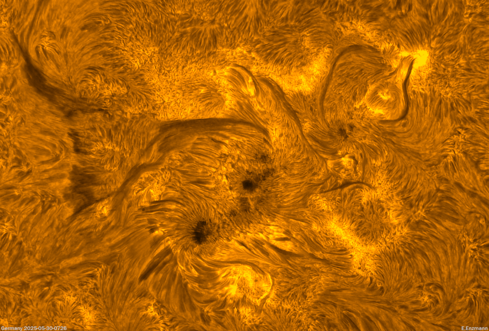 Endlich nach vielen Tagen Regen wieder mal ein blauer Himmel. In einem Moment guten Seeings ist diese H-alpha-Aufnahme heute früh entstanden. Dabei wurde das Teleskop off axis mit 290 mm betrieben. Ein Baader 290 mm großer DERF kam zum Einsatz sowie ein von mir entwickeltes Hapha System. Bei der Aufnahme handelt es sich um kein gestacktes Bild. Es wurde nur das beste Bild aus etwa 4500 Bildern des Videos ausgesucht und mit PS bearbeitet.