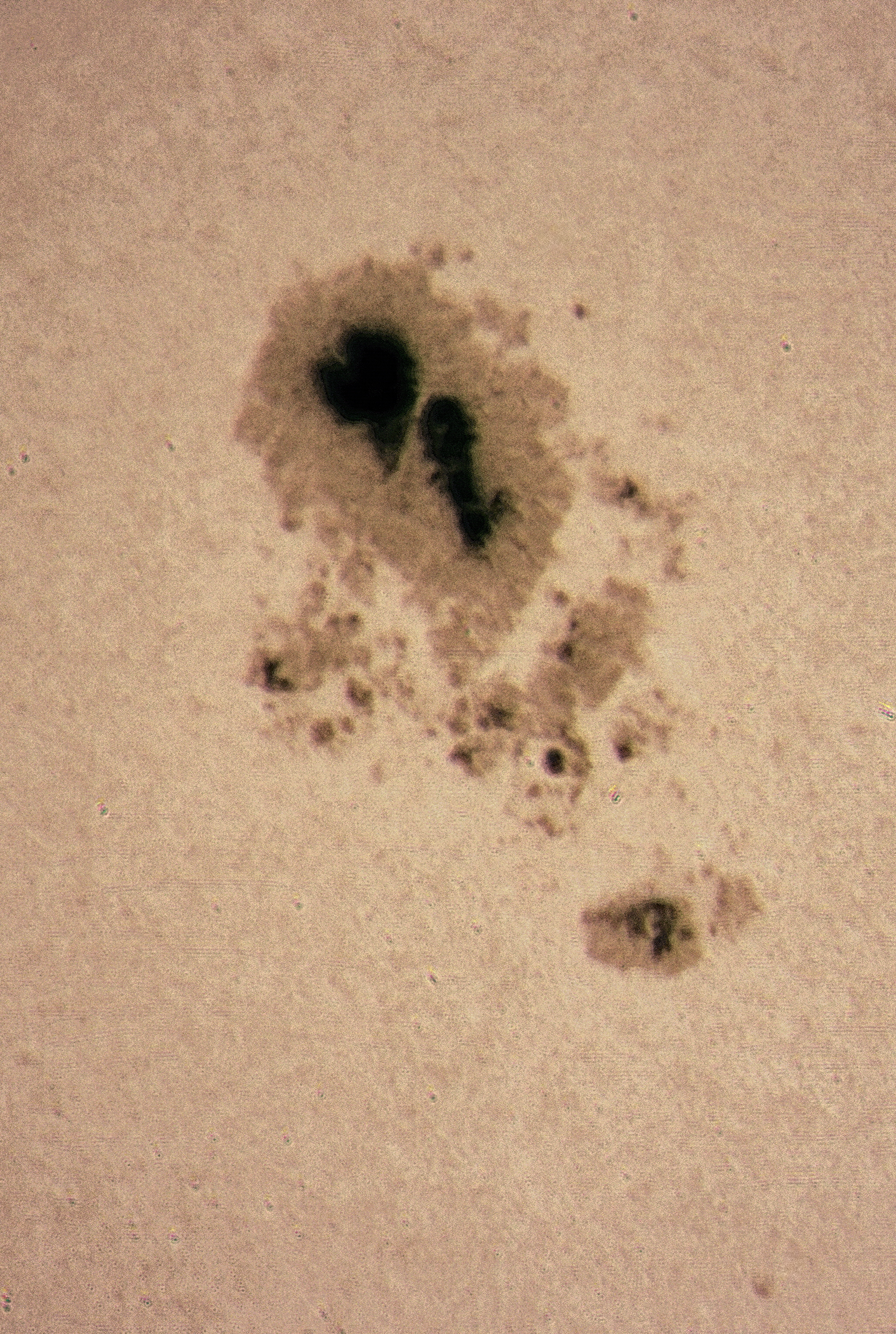 Momentan hat sich auf der Sonne ein besonders großer Sonnenfleck gebildet. Hier ist eine Detailaufnahme mit einem Folienfilter 30 cm Durchmesser von Baader und mit Okularprojektion.