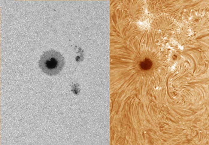 Nicht ein Schwarzes Loch, sondern einen Sonnenfleck so groß wie vier Erden konnte ich am Samstag, den 9. Oktober 2021, einfangen. Interessanterweise hat auch die neue SuW Ausgaebe einen großen Sonnenfleck am Titel. Ein paar Stunden vorher ging eine große Eruption von diesem Fleck aus, die dann gestern für Polarlichter über Skandinavien sorgte. Links sieht man den Fleck wie durch eine Sonnenfinsternisbrille. Rechts das gleiche Gebiet, nur 10000 Kilometer über der Sonnenoberfläche, der so genannten Chromospähre. Hier malen Magnetfelder und Plasma auf der Sonne.