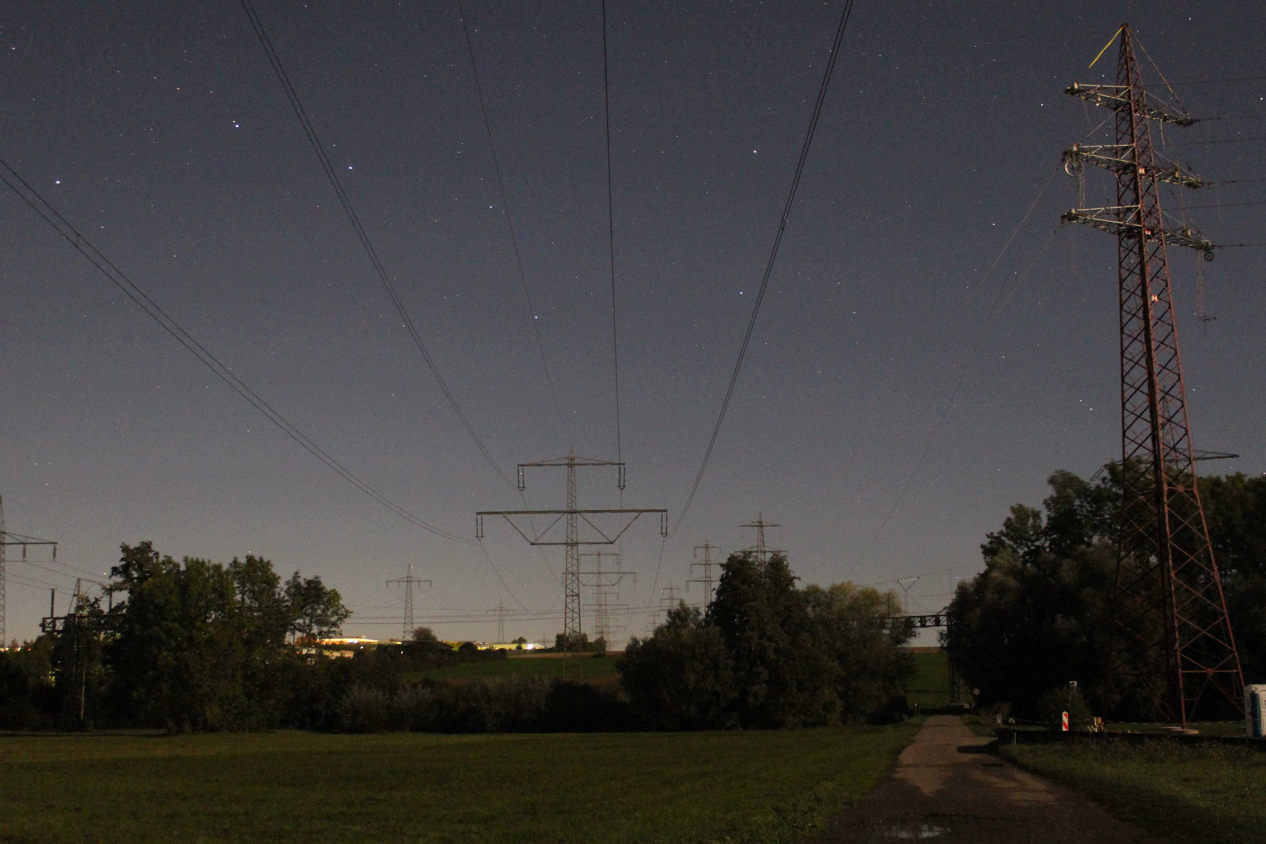 Der Große Wagen in tiefster Stellung, sehr schön erkennt man Mizar und Alkor, mit einer der ältesten Hochspannungsleitungen, der 1926 erbauten 220 kV-Leitung Rheinau-Hoheneck, im Vordergrund.