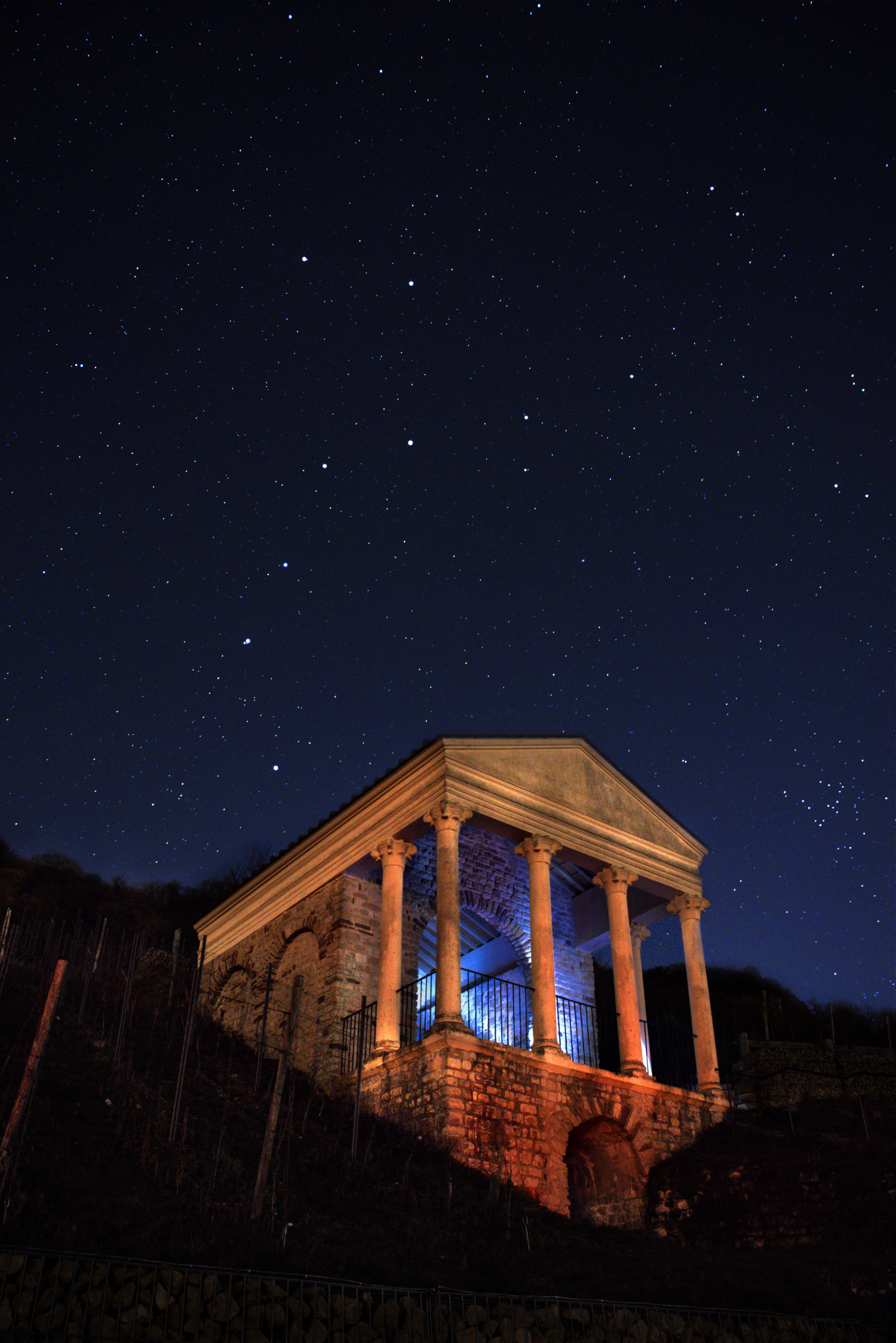 In einem Weinberg bei Igel nahe Trier liegt weithin sichtbar ein kleiner römischer Tempel. Es handelt sich um einen römischen Grabbau aus dem 3. oder 4. Jahrhundert, das sogenannte Grutenhäuschen (Grut = Grotte). Der untere Bereich bildet die eigentliche Grabkammer, darüber befindet sich ein quadratischer Raum. Der vordere Bereich des Obergeschosses ist als Säulenhalle erbaut. Darüber erhebt sich der Sternenhimmel mit dem Großen Wagen, dessen Deichselsterne senkrecht über dem Gebäude stehen. Rechts neben dem Grutenhäuschen befindet sich Melotte 111, bekannt als Coma Berenices Sternhaufen. Ausleuchtung des Grutenhäuschens mit verschiedenfarbigen Taschenlampen.