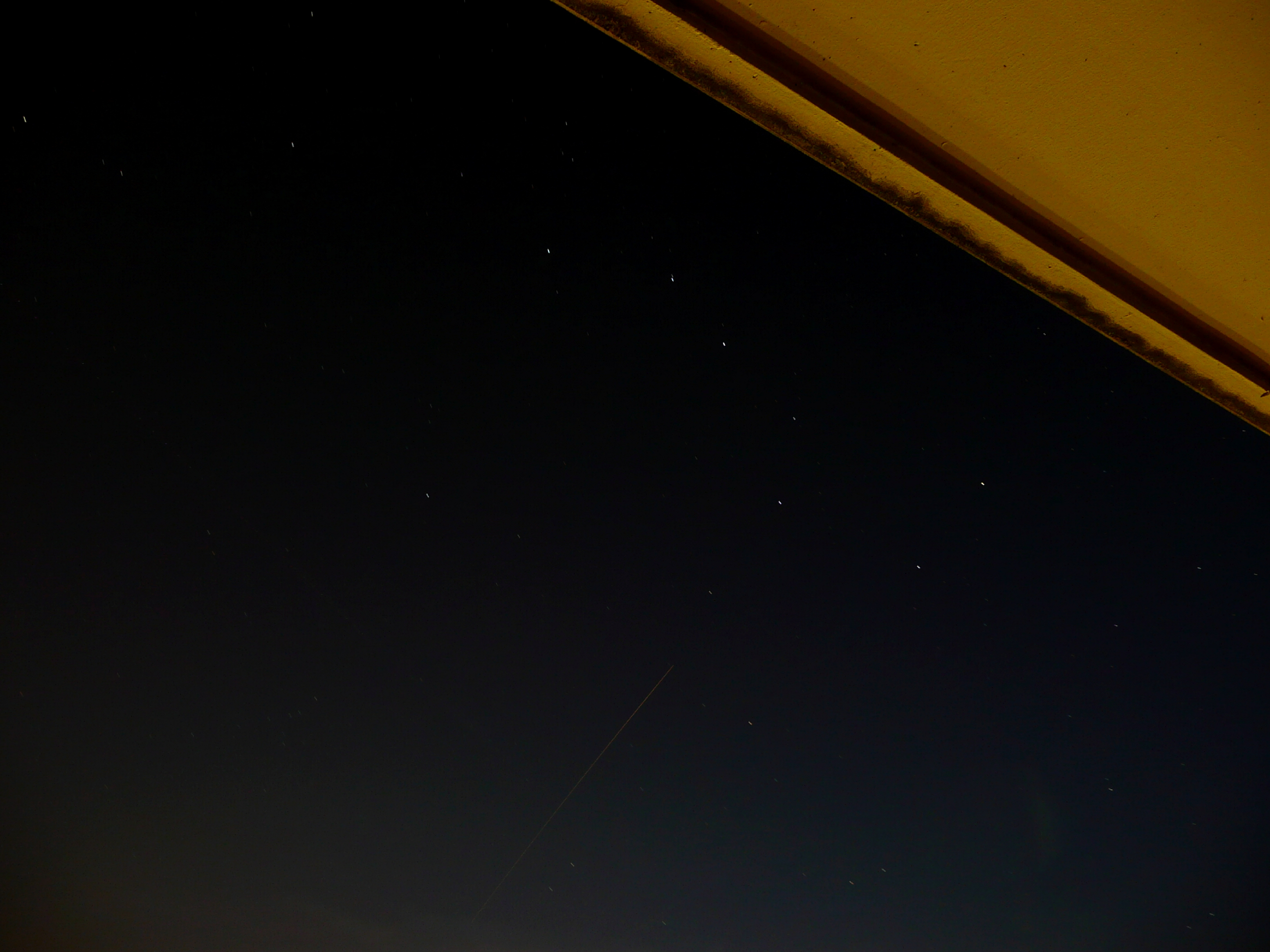 Dies ist der Versuch die Strichspur der ISS zu fotografieren.Da meine Kamera im sog. Sternhimmelmodus nur mit ISO 100 arbeitet versuchte ich es mit 60sek. Belichtung.Und es hat