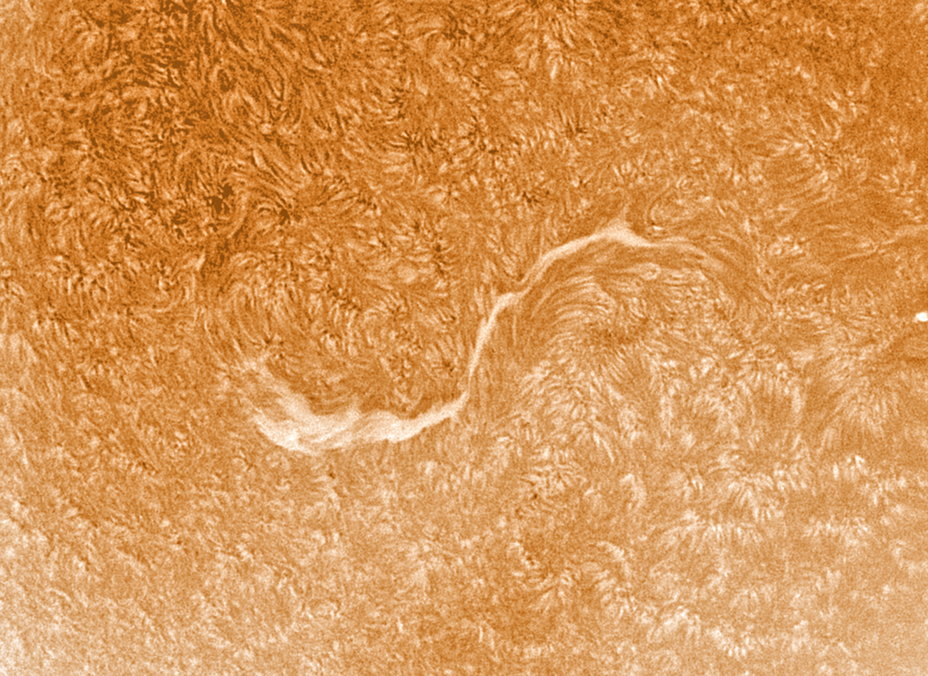 Dieses langgezogene Filament war auf der Sonnenscheibe im H-Alpha-Licht sehr dominant. Das invertierte und farblich bearbeitete Bild ist meiner Meinung nach angenehm zu betrachten. Ich hoffe, dass nicht nur ich das so empfinde.