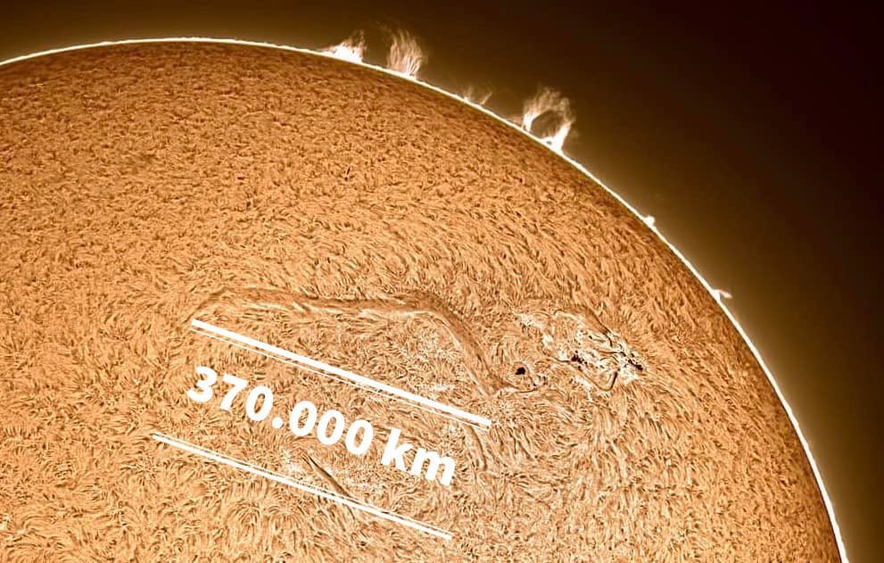 Gestern habe ich den Grund für die Hitze genauer erforscht - unsere Sonne! Und ich wurde nicht enttäuscht. Ich konnte das Größte, von mir bis jetzt beobachtete Objekt auf der Sonne sehen: Ein Filament, 370000 Kilometer lang. Fast die Entfernung Erde - Mond. Dabei handelt es sich um einen riesigen, kühleren Gas/Plasmavorhang, gehalten nur durch Magnetfelder über der Sonnenoberfläche. Wenn man sie von der Seite betrachtet, ist sie eine Protuberanz, wie ich auch einige einfangen konnte, an diesem sonnigen Sonntag. Helios 70x700 und ASI 183MM Kamera