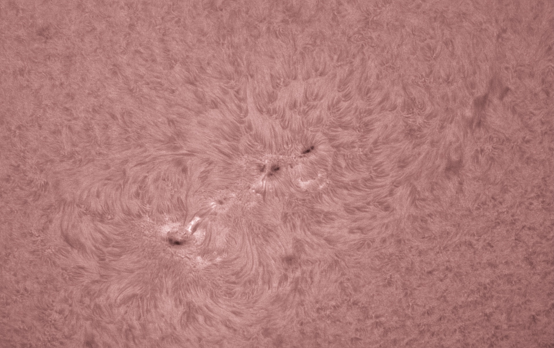Aufnahme auf der Starkenburg-Sternwarte in Heppenheim. Die Aufnahme zeigt ein großes Aktivitätsgebiet im H-Alpha-Licht.