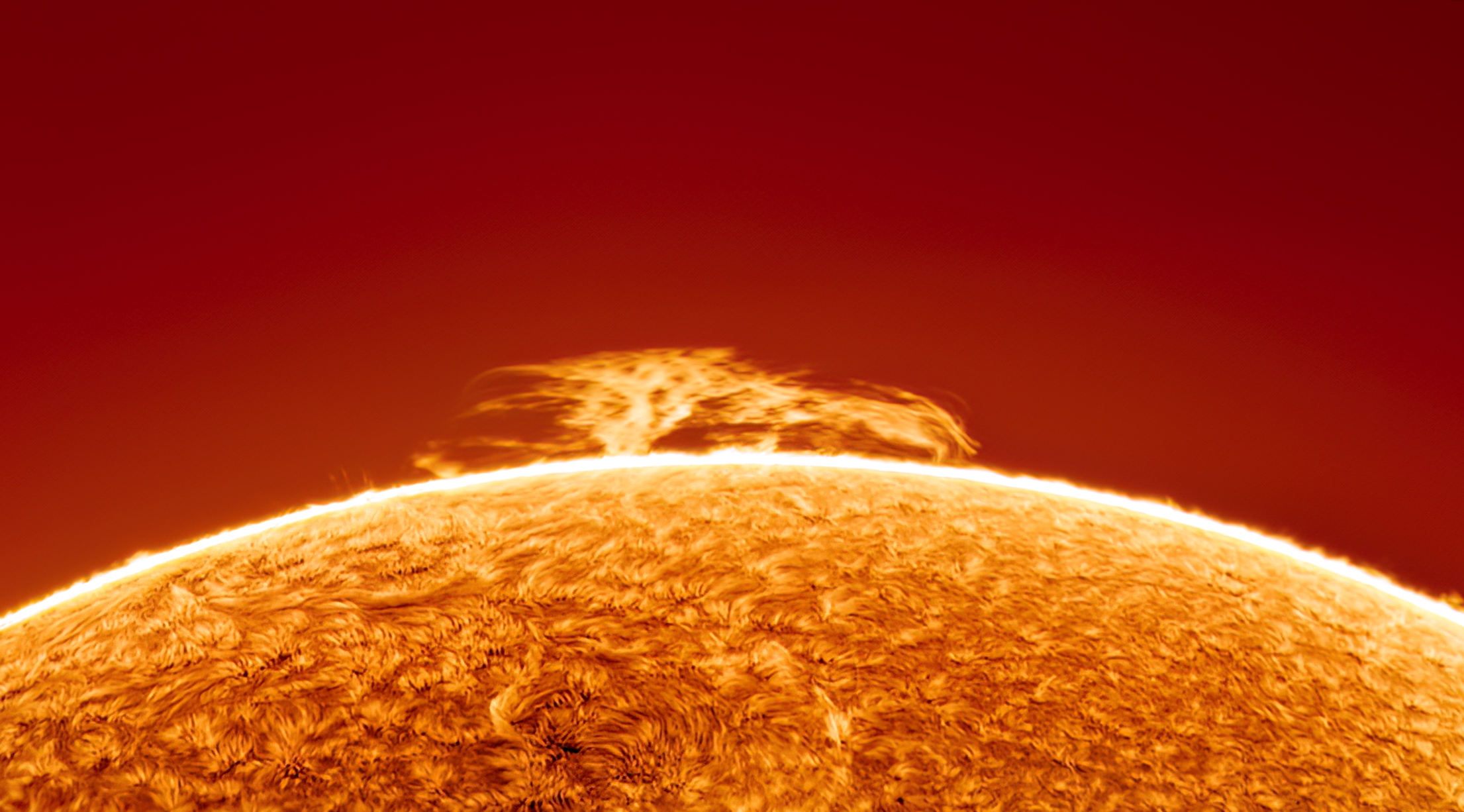 Manchmal sind Protuberanzen nicht sehr hoch, aber dafür ziemlich breit am Sonnenrand. Zu sehen sind diese Strukturen aber nicht mit einem normalen Sonnenfilter, welcher die Sonne einfach nur abdunkelt, sondern ausschließlich mit einem sehr schmalbandigen H-Alpha-Filter