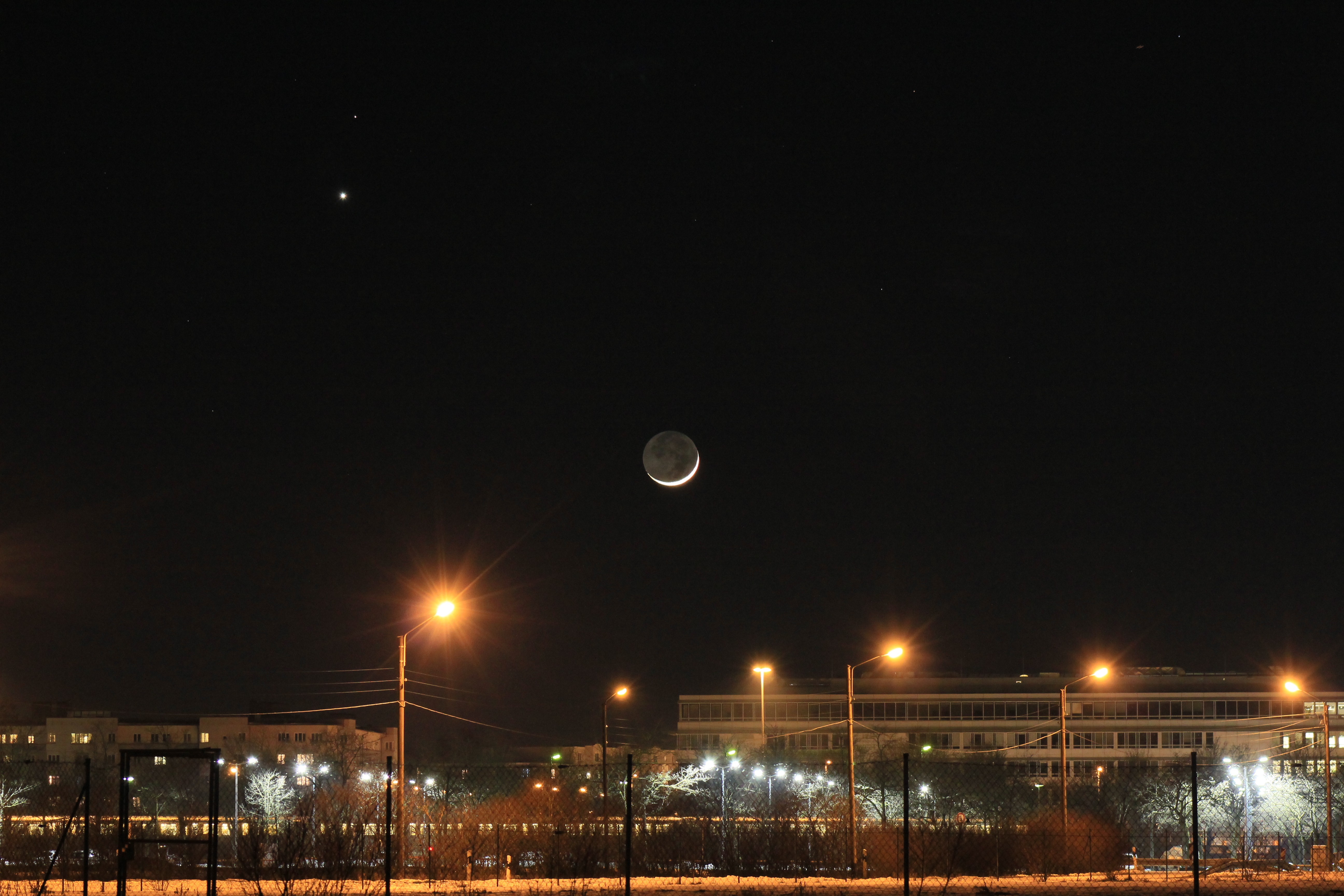 Eigentlich wollte ich auf dem Weg nach Hause nur kurz nach Mars und Venus Ausschau halten, aber der beinahe surrealistische Gesamteindruck, hauptsächlich hervorgerufen durch das extrem gut sichbare Aschgrau des Mondes an diesen Abend, haben mich veranlasst die Szenerie zu "konservieren". Der gelbe Streifen am untern Bildrand dürfte die U-Bahn sein.