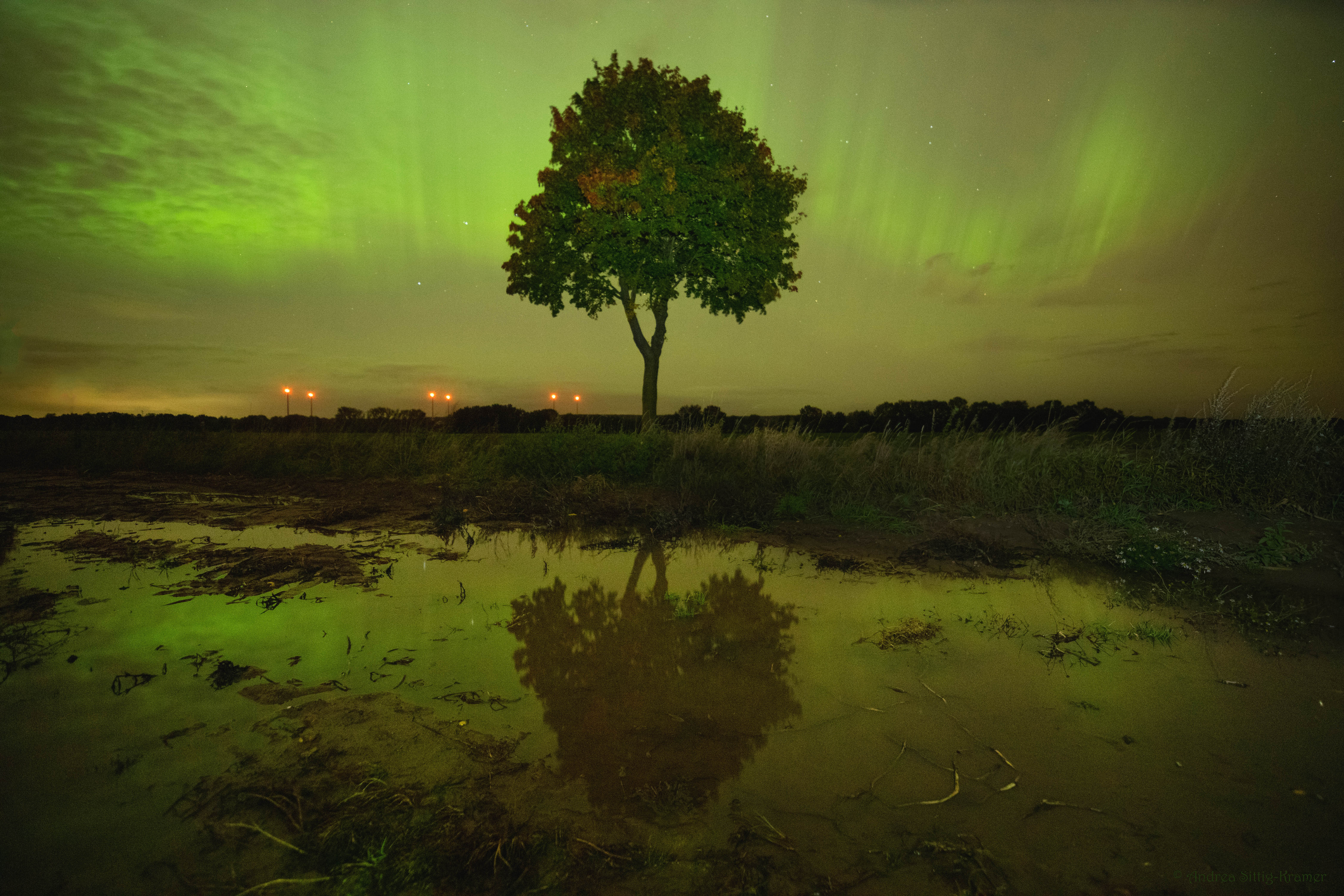 In der Nacht vom 10./11. Oktober 2024 waren in ganz Deutschland einmal mehr Polarlichter zu beobachten. Die Tage zuvor wurden in zahlreichen (sozialen) Medien extrem starke Sonnenwinde gemeldet und der KP-Index stieg im Laufe der Nacht auf Werte von Neun, auf der Skala von 0 - 9. Ab 20 Uhr konnte ich rote und grüne Nordlichter deutlich visuell am Nordhorizont sehen. Ich fuhr sofort los, um dieses Mal das himmlische Lichterspiel an verschiedenen Foto-Spots im Landkreis Uelzen zu fotografieren. Dieses Bild entstand auf einem Feld, dass durch die heftigen Regenfälle der vorherigen Tage unter Wasser stand. Ich positionierte meine Kamera so, dass ich die Spiegelung des freistehenden Baumes samt grüner Aurora am gesamten Himmel ablichten konnte. Schlammige Schuhe und nasse Füße schmälerten den Genuss des grandiosen Schauspiels nicht.