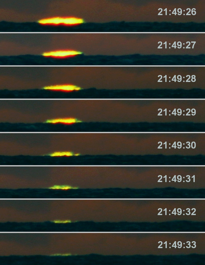 Am Abend des 24. Juni 2017 nördlich von Ahrenshoop, am Darß auf dem Deich war vor Sonnuntergang im Westen noch starke Bewölkung. Erst zwei Minuten vor Sonnenuntergang klarte der Horizont auf. Ab 30 Sekunden vor Sonnenuntergang nahm ich schließlich in rascher Folge Bilder auf und konnte dabei deutlich einen grünen Saum an der oberen Seite der Sonne sehen und gleichzeitig fotografisch festhalten. Aus einer Auswahl dieser Aufnahmen entstand diese Serie der letzten acht Sekunden vor dem Sonnenuntergang.