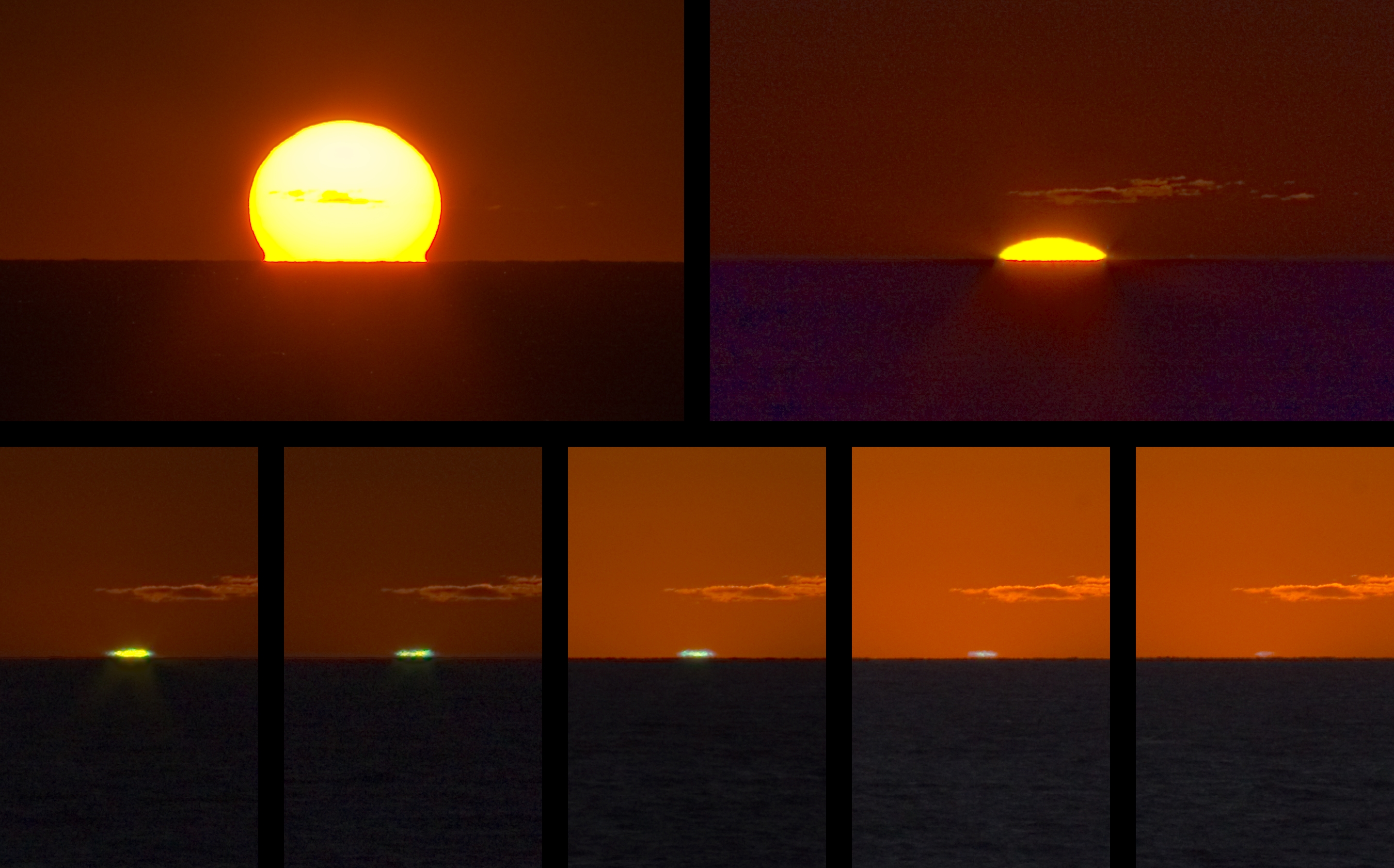 Meine bisher schönste Beobachtung eines Grünen Strahls gelang mir im Juli von der Fähre Helsinki-Travemünde nordwestlich von Hiiumaa/Dagö. Schon als die Sonne dem Horizont entgegensank, bildete sich mit Hilfe einer unteren Luftspiegelung eine "Omega"-Form. Laut Literatur ein guter Vorbote für den Grünen Strahl, mir aber aus eigenem Erleben noch nicht bekannt - ich war ganz einfach vorher zu selten am Meer. Im Inland sieht das anders aus, dort sind vor allem Inversionsschichten entscheidend. Die untere Bildreihe entstand rund fünf Minuten später im Verlauf von sechs Sekunden durch "Dauerfeuer" mit dem Kabelauslöser. Bei aller gebotenen Vorsicht wollte ich mir nämlich den visuellen Eindruck nicht entgehen lassen. Der schnelle Farbwechsel von Gelb über Grün nach Cyan war beeindruckend und die Fotos beweisen, dass es keine Einbildung war. Der nachträgliche Vergleich mit Simulationen (https://aty.sdsu.edu/explain/simulations/inf-mir/colors/GFcolors.html) machte klar, dass ich hier ein echtes "Lehrbuchbeispiel" erwischt hatte!