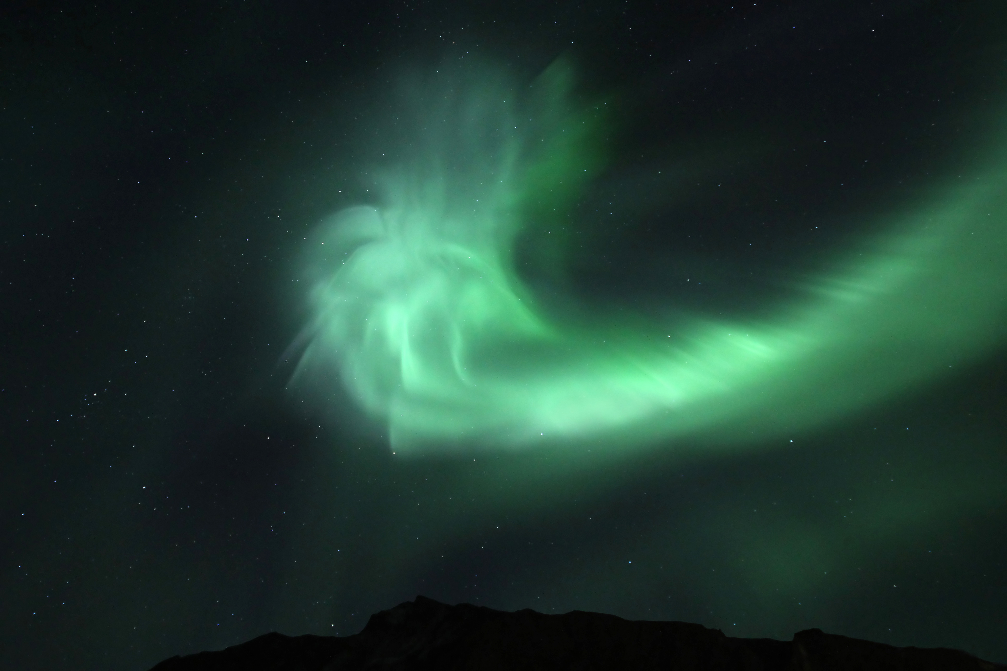 In der Nacht vom 24. auf den 25. September 2014 konnte ich spektakuläre Nordlichter über den Lofoten beobachten. Dabei zeigte sich auch diese einzigartige Nordlichtkorona, die einem sich drehenden Wirbel glich. Weitere Bilder finden Sie auf meiner Webseite: www.zumnordlicht.com