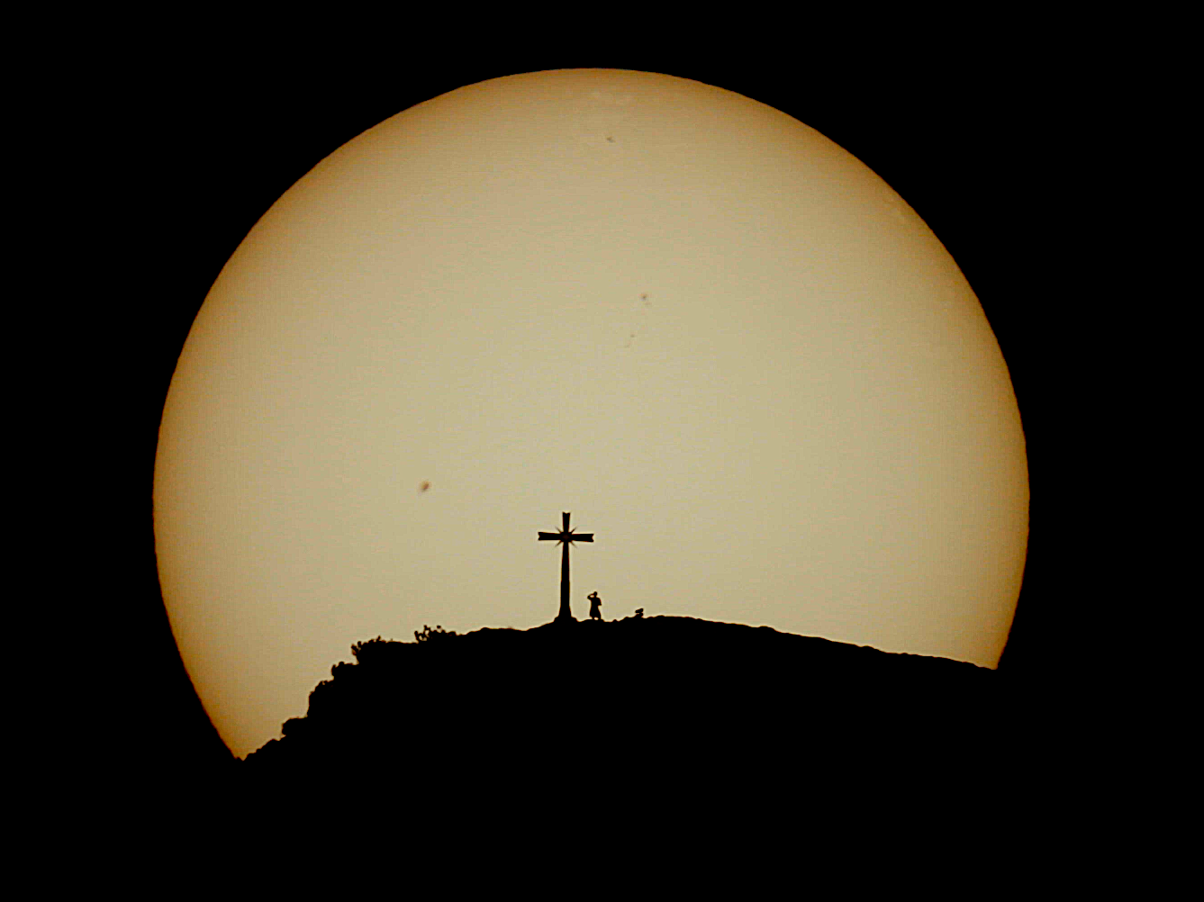Vom 1000 Meter tiefer gelegenen Inzell im Südosten Bayerns filmte ich den Sonnenaufgang über dem 5 km entfernten Gipfelkreuz des Gamsknogel. Zufällig war ein Wanderer genau zur richtigen Zeit dort und schien die Sonne zu grüßen. Das Bild stammt aus einem Video in https://www.dufters.de/Alfred/Astronomie/index.htm bei Zeile »Gruß an die Sonne«.