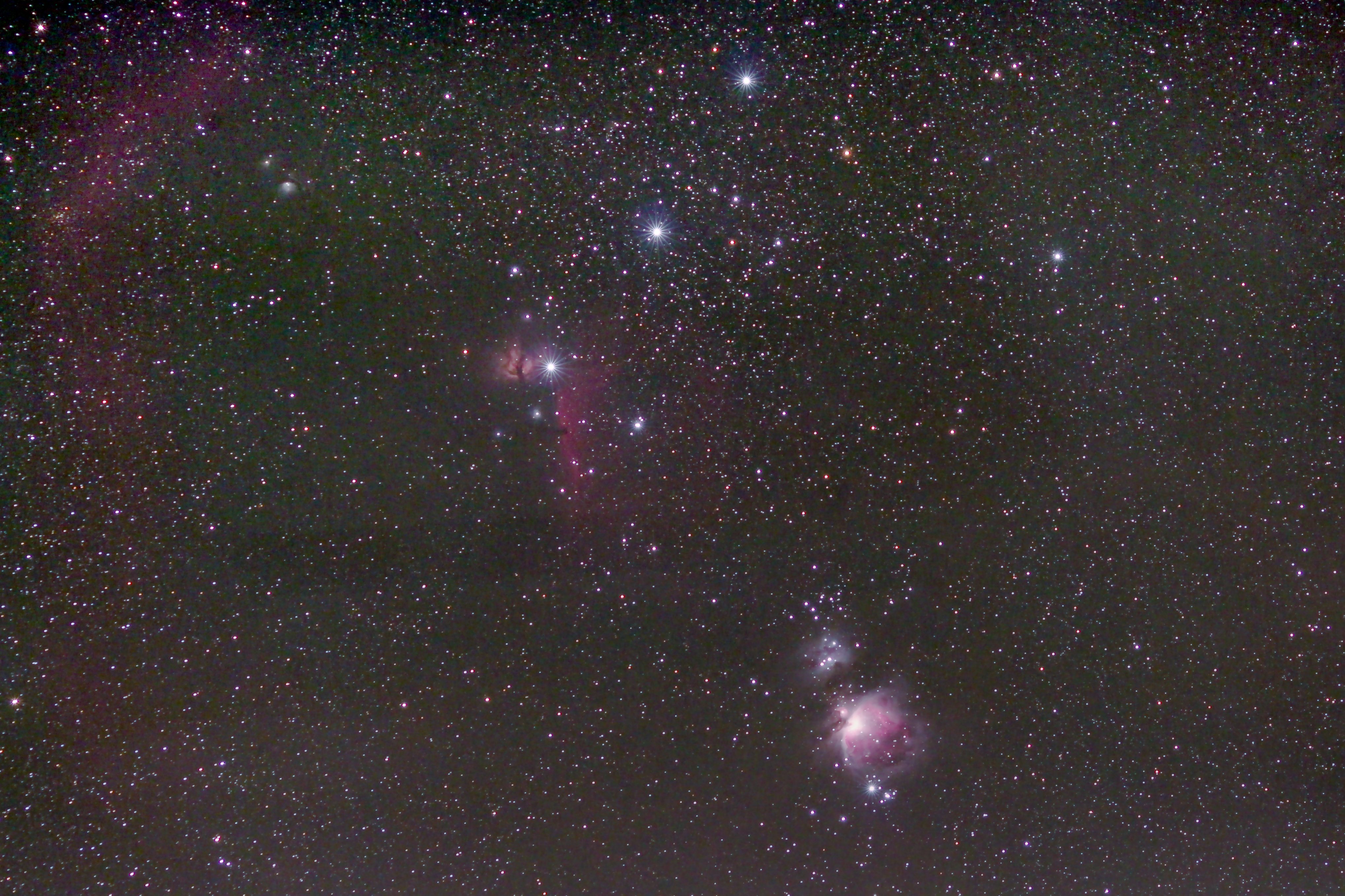 Messier 42 und Messier 43 (Orionnebel), Flammennebel, Pferdekopfnebel, Running Man sowie einen Teil von Barnards Loop.