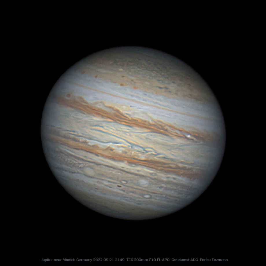 Am 21. September kurz vor Mitternacht hat sich das lange Warten gelohnt, als auf einen Schlag von einer Minute auf die andere das sehr mittelmäßige Seeing für rund 14 Minuten gut wurde. In dieser Zeit ist dann dieses recht detailreiche Jupiterbild entstanden. Es gehört zu den besten mit dem 300-mm-TEC APO bis heute gemachten Planetenbildern.