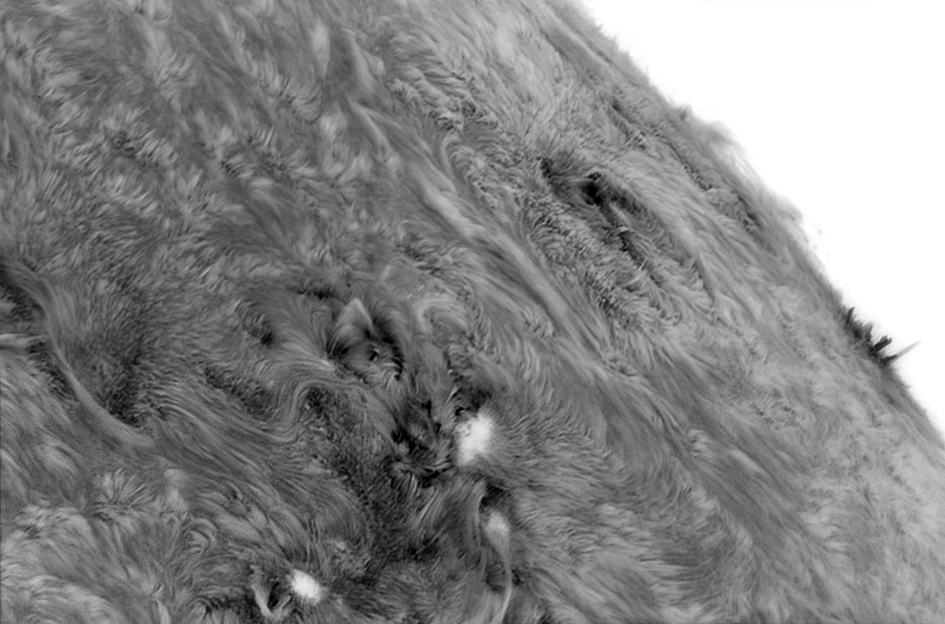 H-Alpha-Filterung mit einer Doublestack-Kombination aus zwei Etalons (Solar Spectrum 0.7A und Solarmax 60 im Okularauszug), Öffnung 140 mm