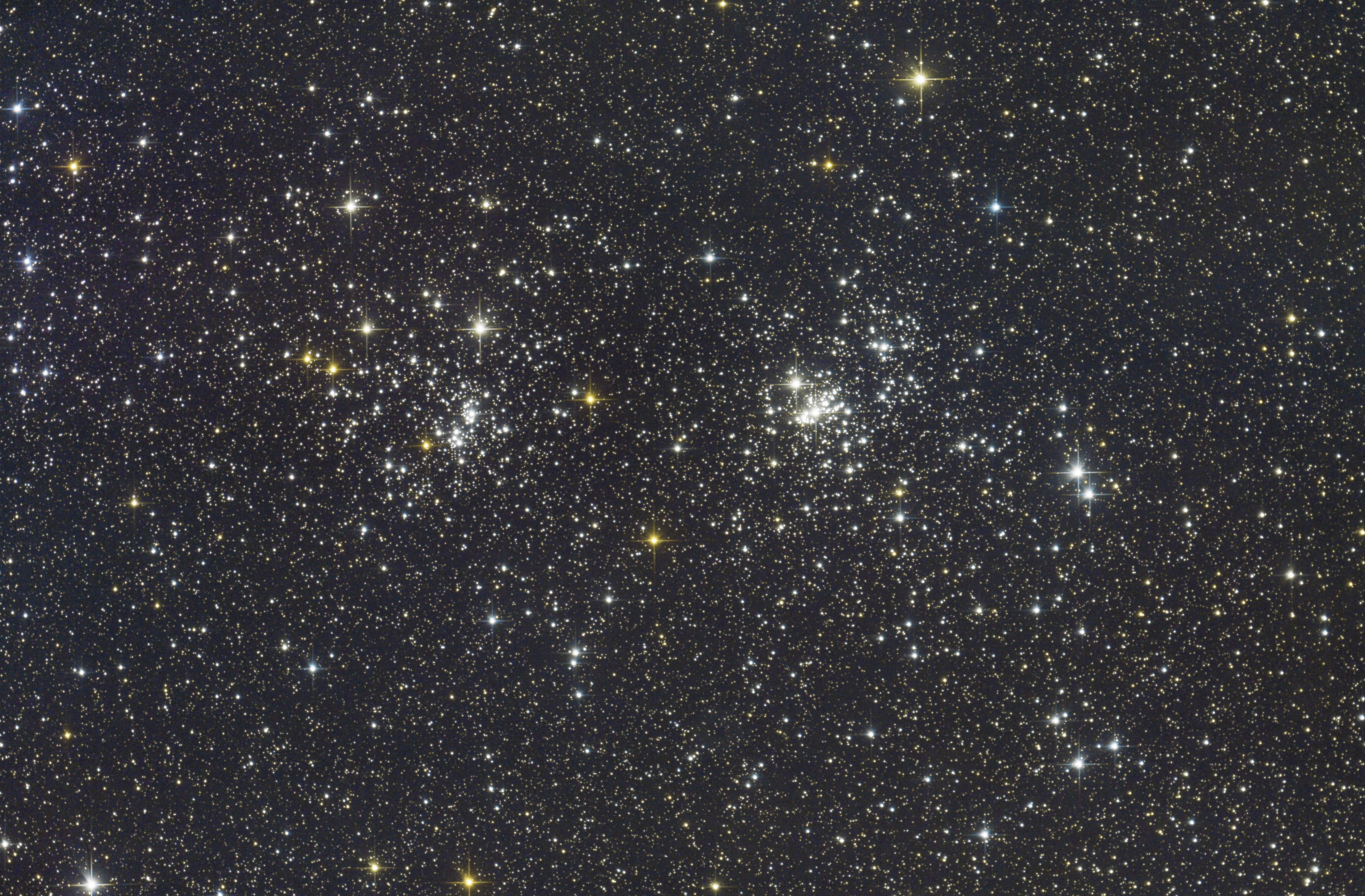Zwei dicht zusammenliegende offene Sternhaufen im Sternbild Perseus. An einem dunklen Platz sind die beiden mit freiem Auge schon als nebelige Flecken zu erkennen.