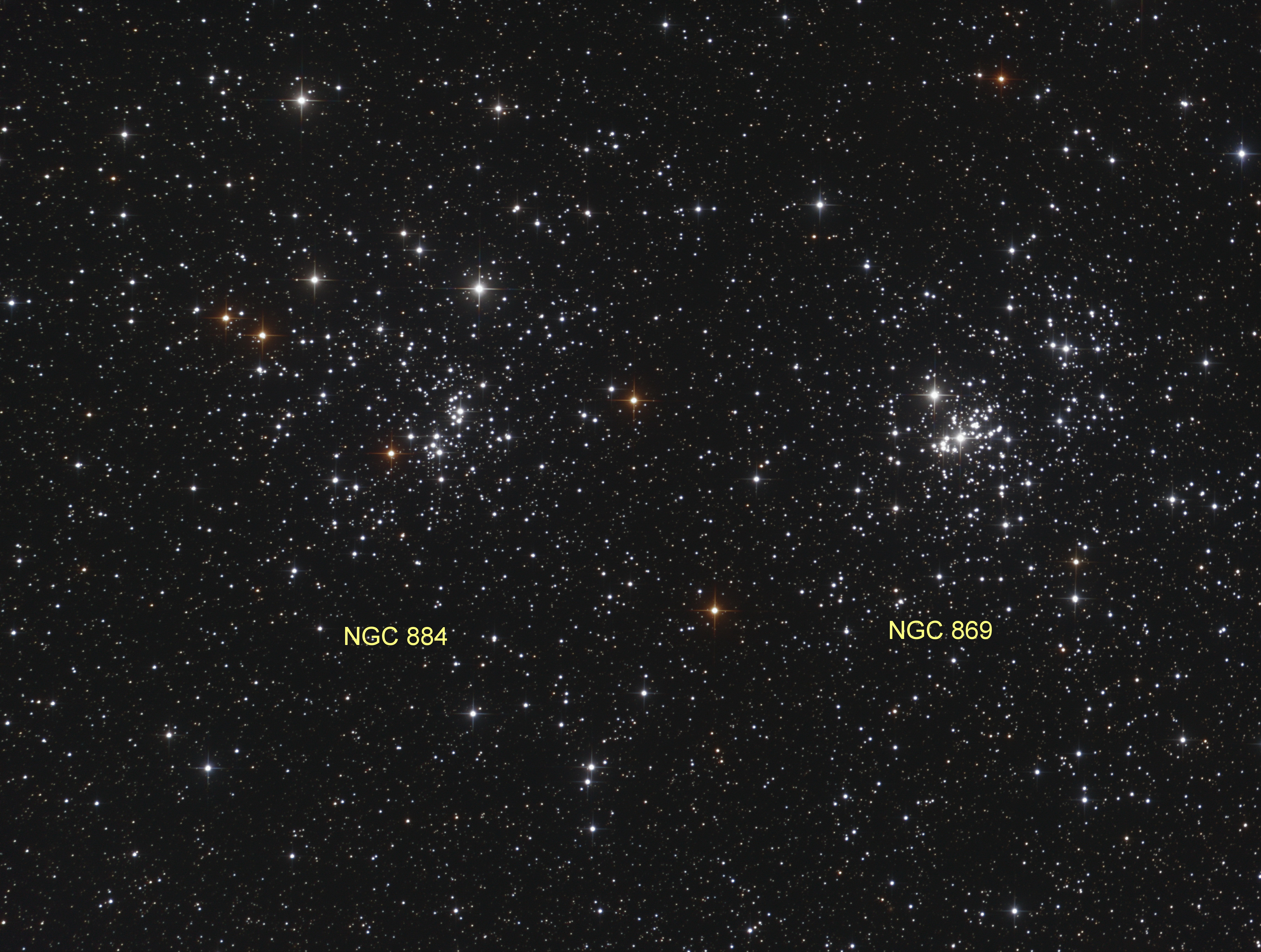 h Persei (NGC 869) und Chi Persei (NGC 884) sind zwei helle offene Sternhaufen mit jeweils 30 Bogenminuten Ausdehnung. Sie sind etwa 8300 Lichtjahre entfernt und wurden im Jahr 130 v. Chr. vom griechischen Astronomen Hipparch entdeckt.