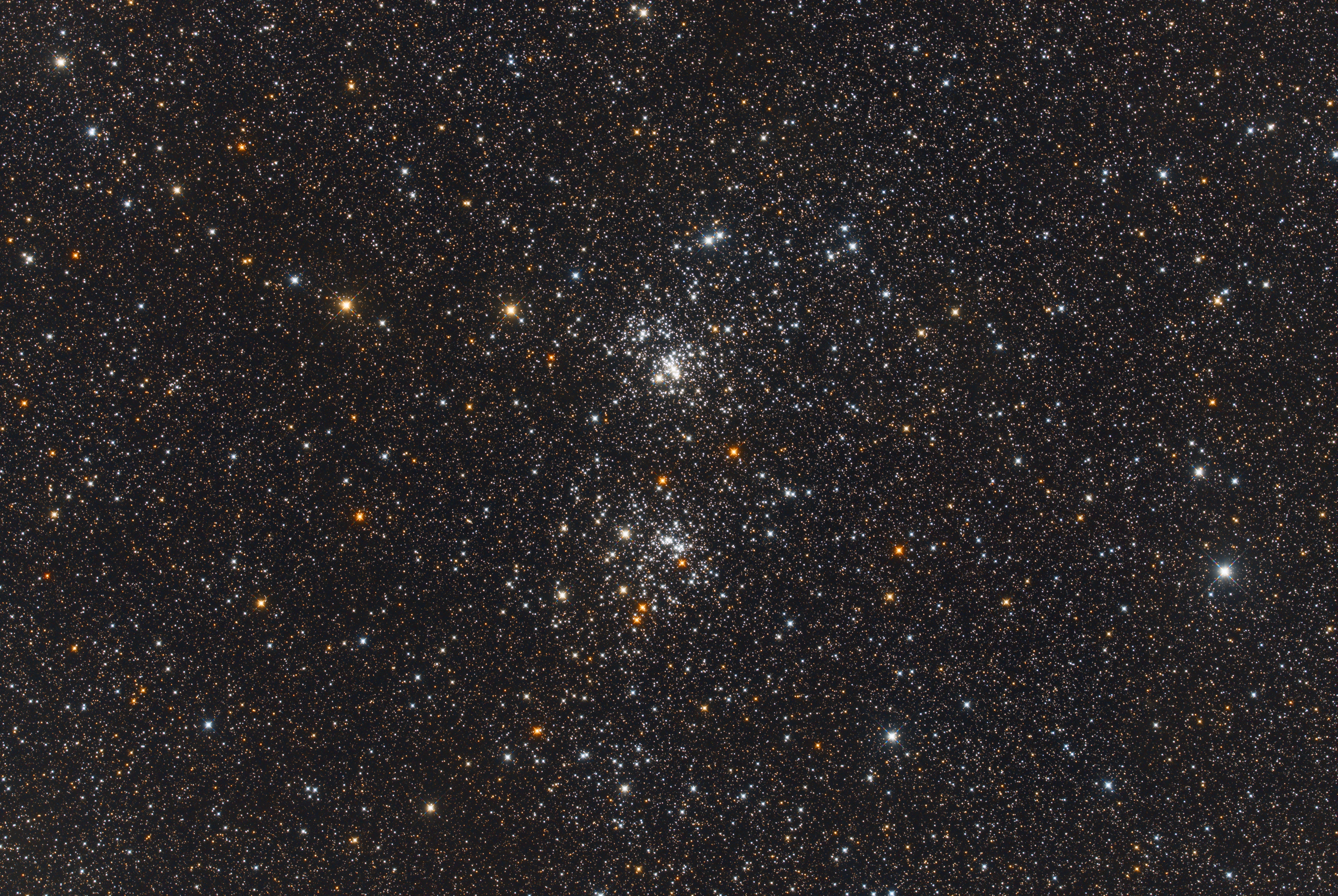 Der Doppelsternhaufen im Perseus bestehend aus NGC 869 und NGC 844. Die meisten der sichtbaren Sterne sind blaue Riesensterne doch NGC 844 zeigt auch einige rote Riesen.