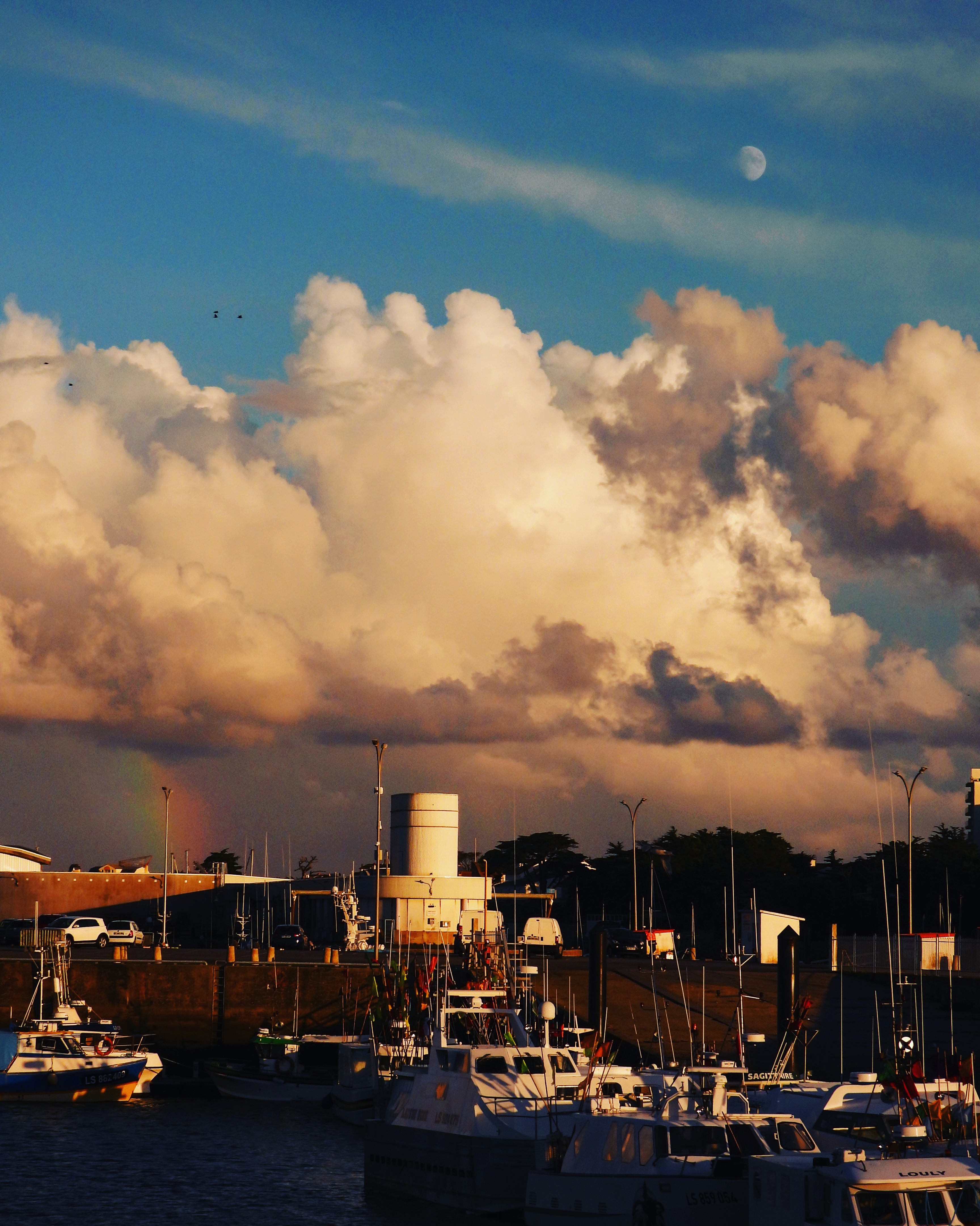 Der Mond leuchtete am blauen Himmel, während darunter ein Regenbogen mit Unwetterwolken hinter einem Hafen zu sehen war.