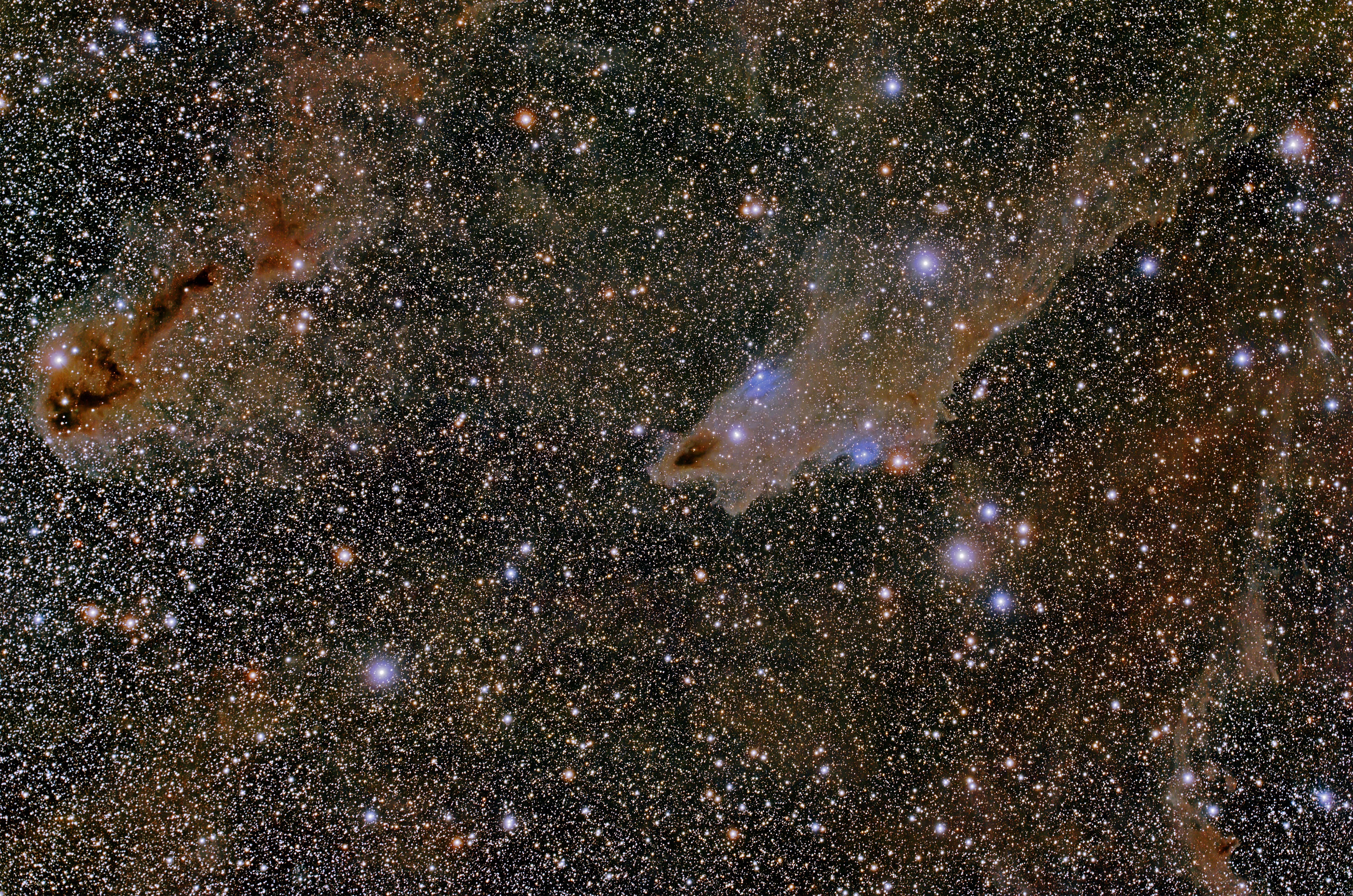 Das Sternbild Kepheus - so unscheinbar es auch ist - bietet Astrofotografen zahlreiche attraktive Objekte. Die Augustnächte sind ideal für Aufnahmen: ein bereits passables Zeitfenster für Aufnahmen, die Nächte sind noch warm, und Kepheus steht so schön hoch am Himmel. Ich konnte der Versuchung nicht widerstehen, an einen dunklen Ort in den Pfälzerwald zu fahren, um eines meiner Prio 1-Wunschobjekte aufzunehmen. LDN 1235 wird aufgrund seiner einzigartigen Form als Haifischnebel bezeichnet, dabei ist er eigentlich nur das Auge des viel größeren Nebelkomplexes LB 535. Der Komplex ist etwa 650 Lichtjahre von der Erde entfernt und besteht aus interstellarem Staub, der das Licht dahinterliegender Sterne verdeckt. Innerhalb des gesamten Nebelkomplexes befinden sich noch zwei auffällig helle, blaue Reflexionsnebel, die von heißen Sternen des Spektraltyps B8 beleuchtet werden: im Nacken des Hai‘s VdB 150 und am Bauchansatz VdB 149. Am linken Bildrand befindet sich der Anglerfischnebel LDN 1251, eine weitere große Molekülwolke im Sternbild Kepheus, die etwa 1.000 Lichtjahre entfernt ist. Das Bild bildet eine Fläche von etwa 3,5 x 5,3 Grad ab. Die Nebelkomplexe sind relativ schwach: auf den Einzelaufnahmen ist von ihnen nichts zu erkennen.