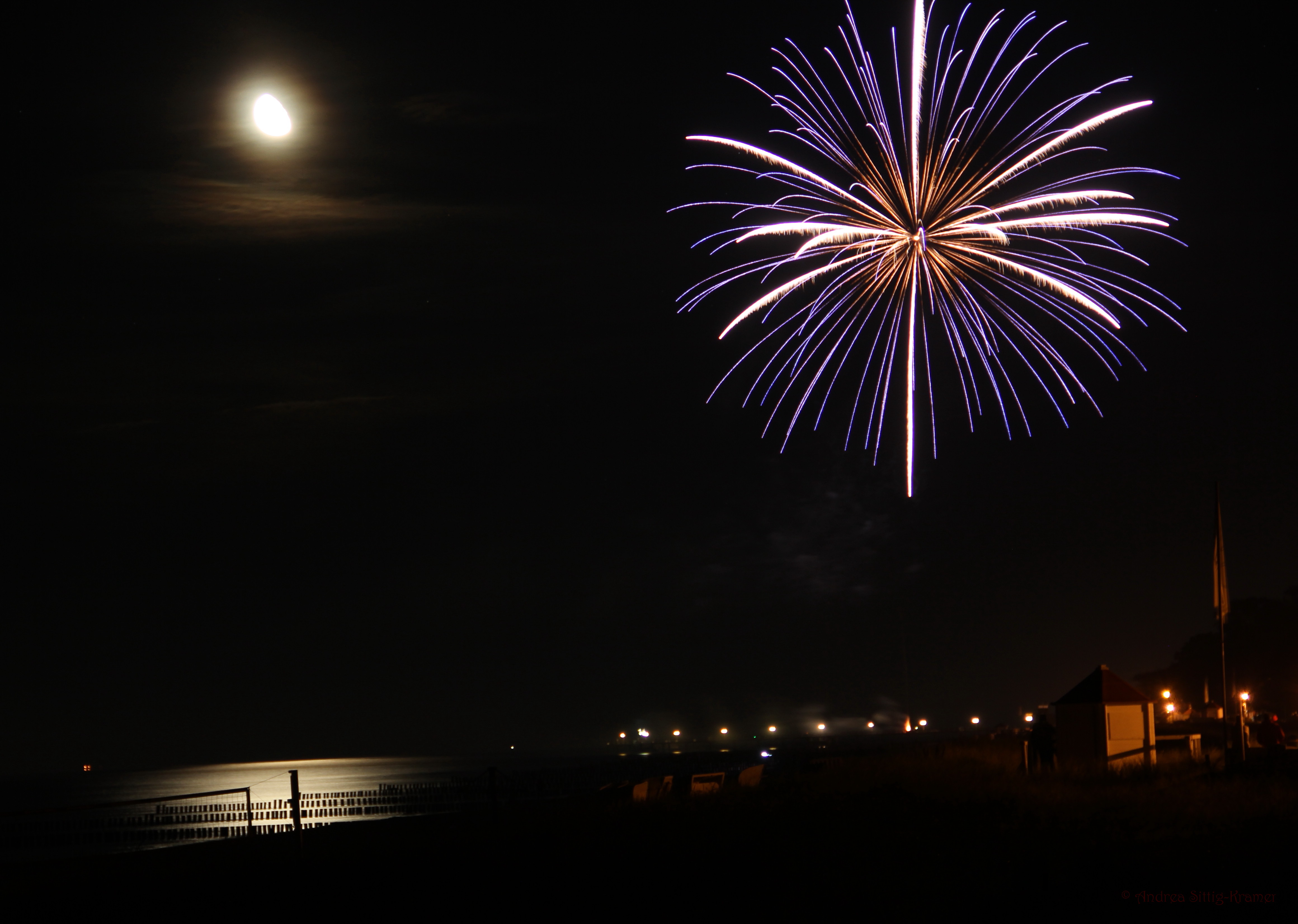 Für kurze Zeit konkurrierte das bunt-flimmernde künstliche Licht am Nachthimmel mit dem ruhig scheinenden Mond. Die beiden Lichtquellen schienen von meinem Standort aus in direkter Nachbarschaft zu leuchten.