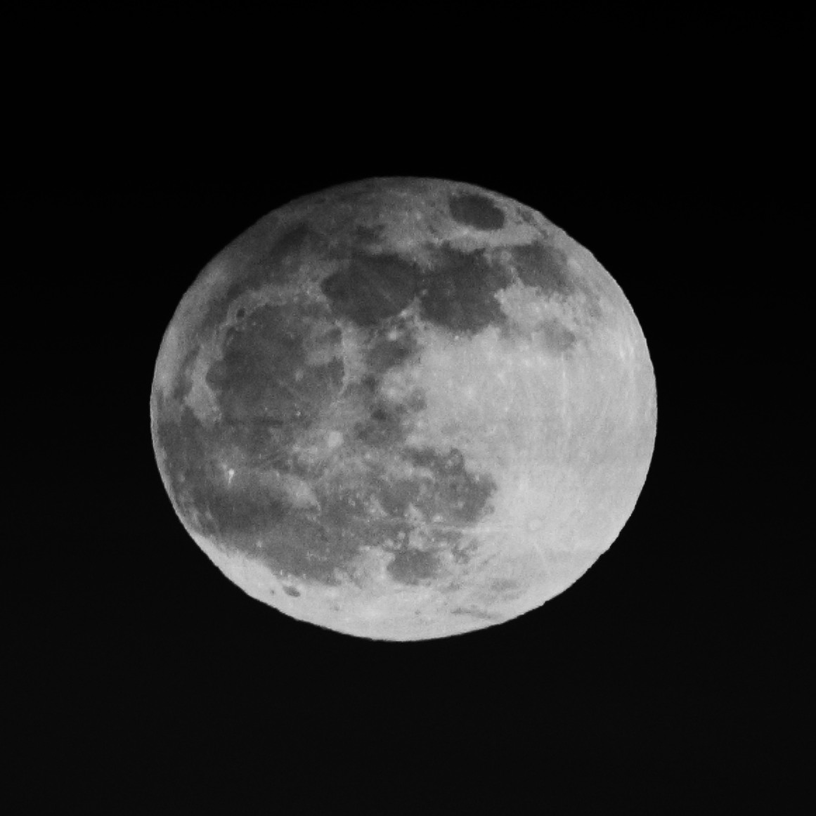 Ein Foto der Halbschatten-Mondfinsternis vom 5. Mai 2023 mit dem Teleobjektiv f = 300 mm um 20:28:07 Uhr MESZ habe ich heraus vergrößert. Mit heftiger Kontrastverstärkung auf der Schwarzweissaufnahme ist der Halbschatten ein wenig deutlicher geworden.