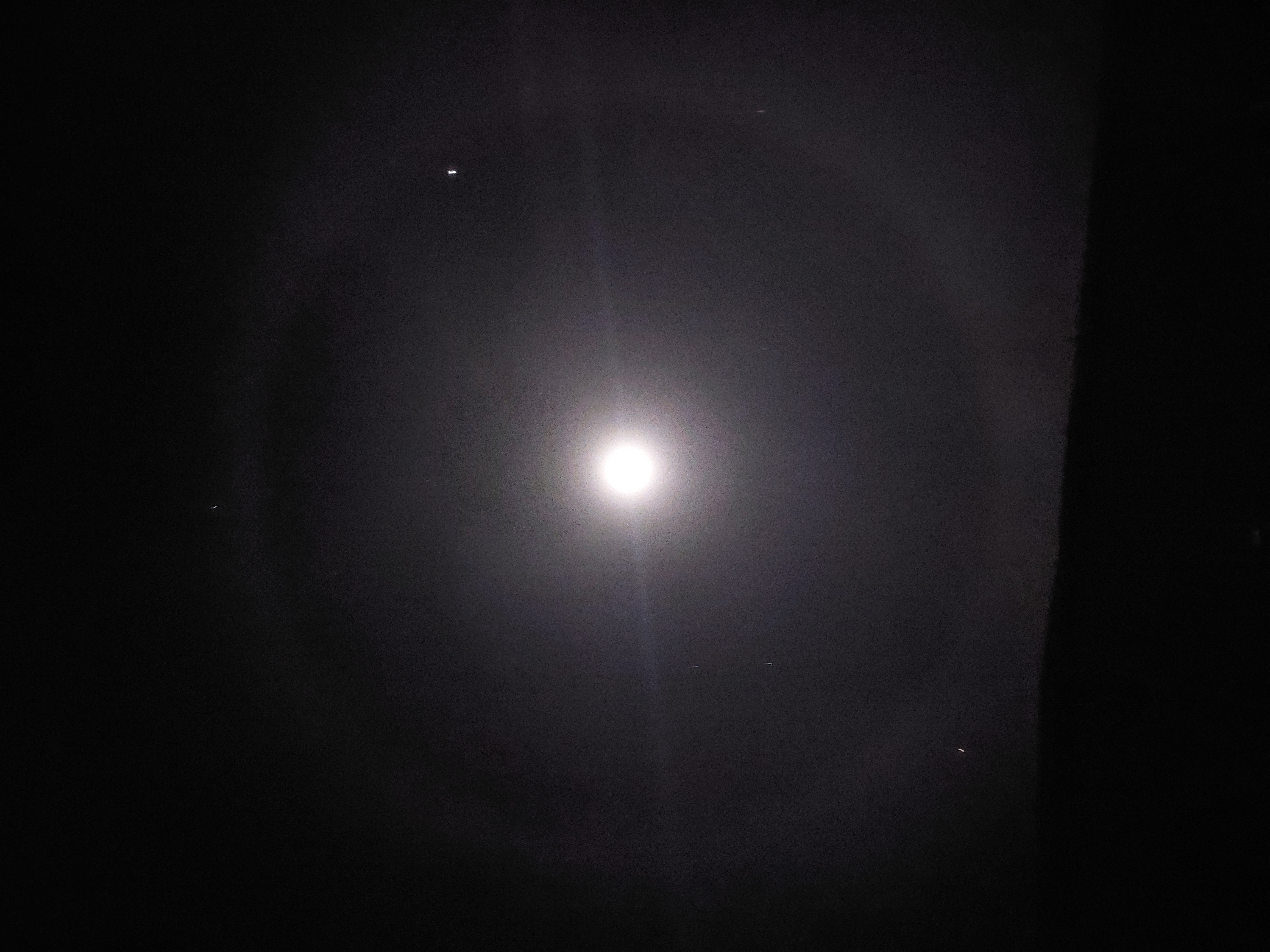 Mit dem bloßen Auge sieht man einen deutlichen weißen Ring mit großem Abstand zum Mond.