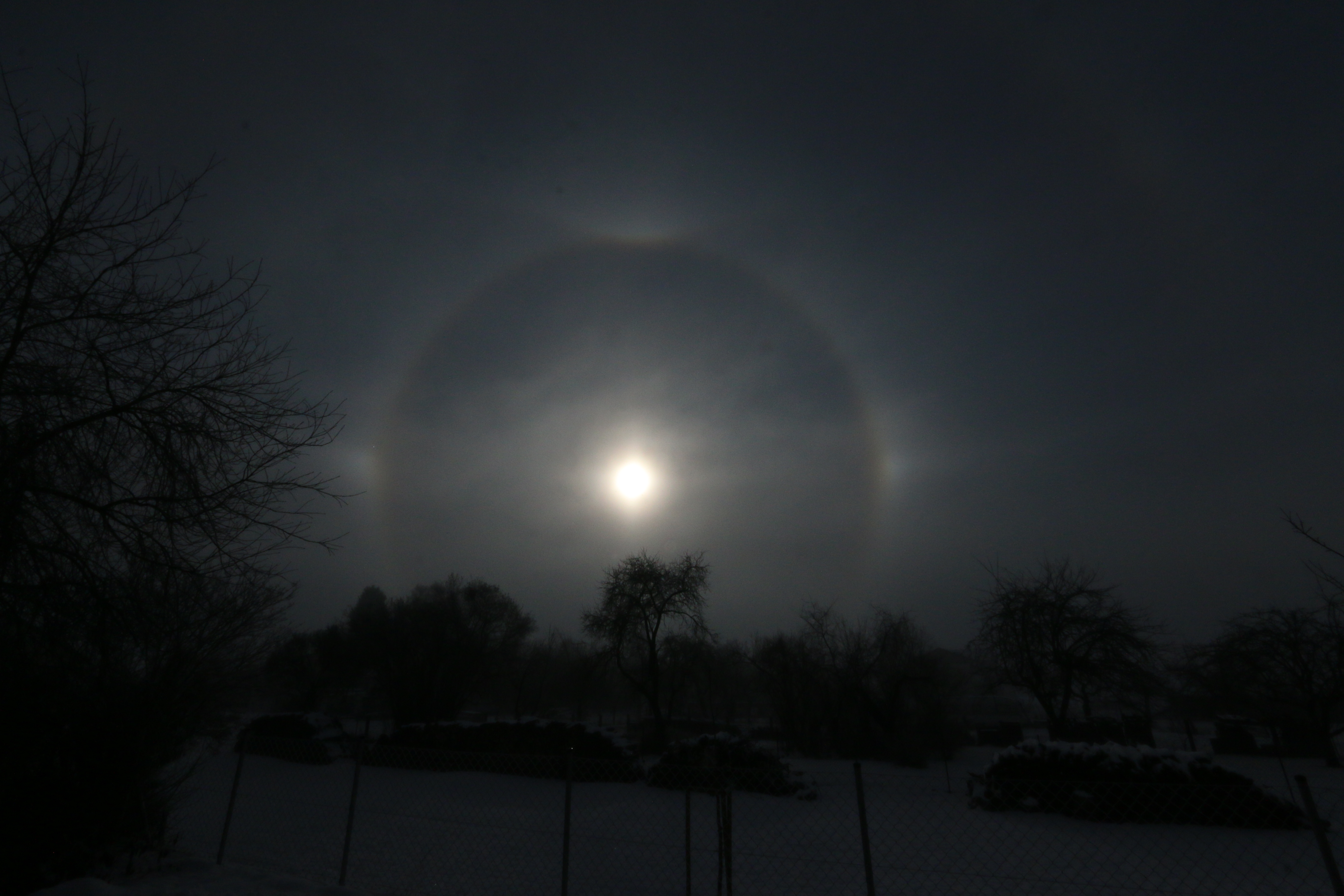 Am Montag war eigentlich blauer Himmel hier in Bolheim/ Herbrechtingen. Es bildete sich gegen 10:30 Uhr ein ganz feiner, fast samtiger Dunst und Richtung SSO, also Richtung Sonne. Man sah man einen Halo mit Nebensonnen. Ich machte einige Aufnahmen auch mit unterschiedlicher Belichtung. Auf der obigen Aufnahme meint man sogar einen zweiten Halo rechts oben zu sehen. Nach etwa 35 Minuten war das Phänomen verschwunden. Hier in unserer Gegend habe ich so ein Phänomen noch nie gesehen. (Ich könnte gerne noch mehrere Bilder liefern.)
