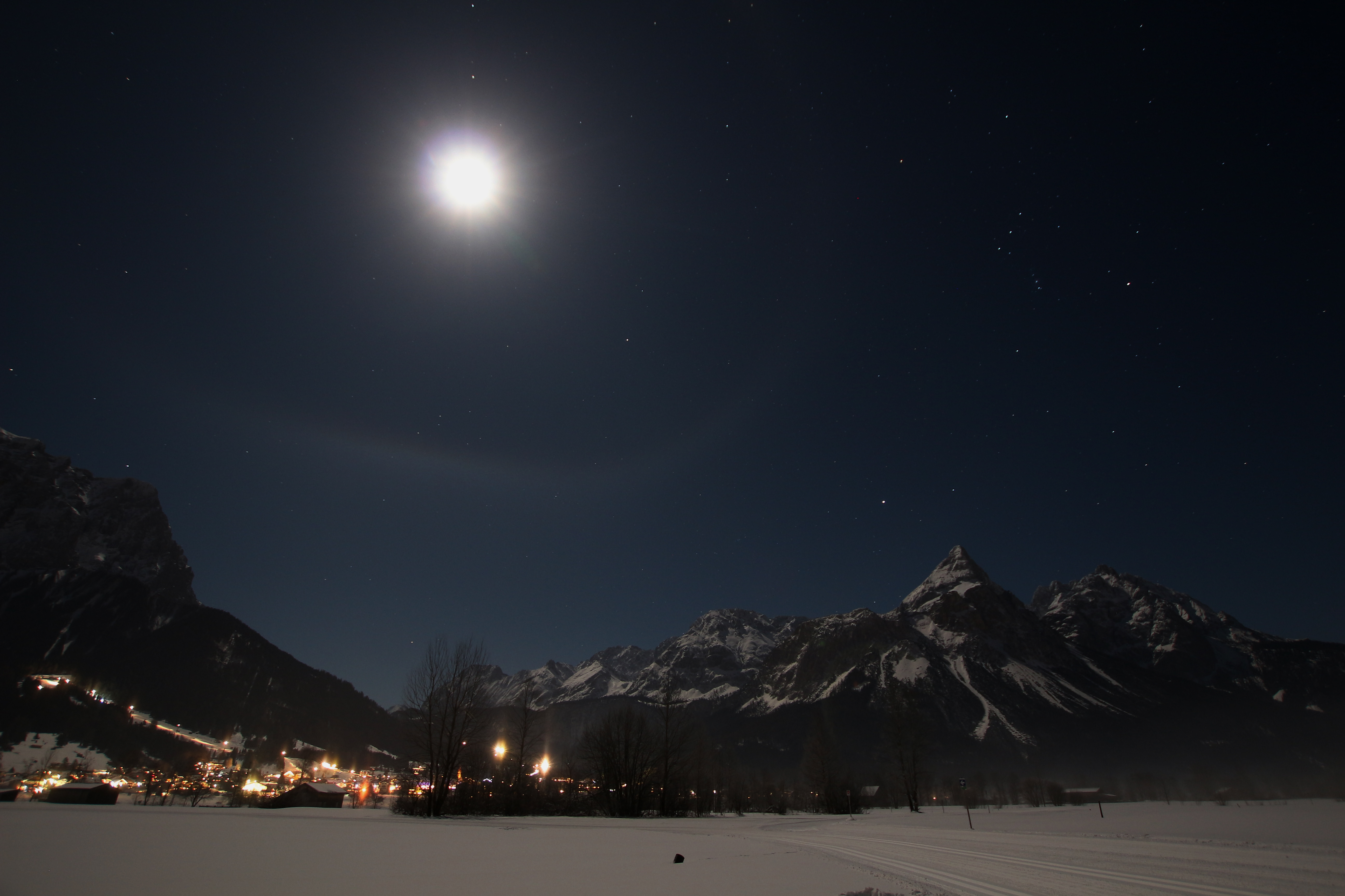 Auf dem Weg zu einem Winterwochenende nach Mittenwald machte ich einen kurzen Stopp bei Ehrwald in Tirol und konnte einen schönen Halo um den Vollmond über der Zugspitze sehen. Während ich die vom Mondlicht beleuchtete Winterlandschaft fotografierte, verformte sich der kreisrunde Halo oval und verschwand schließlich.