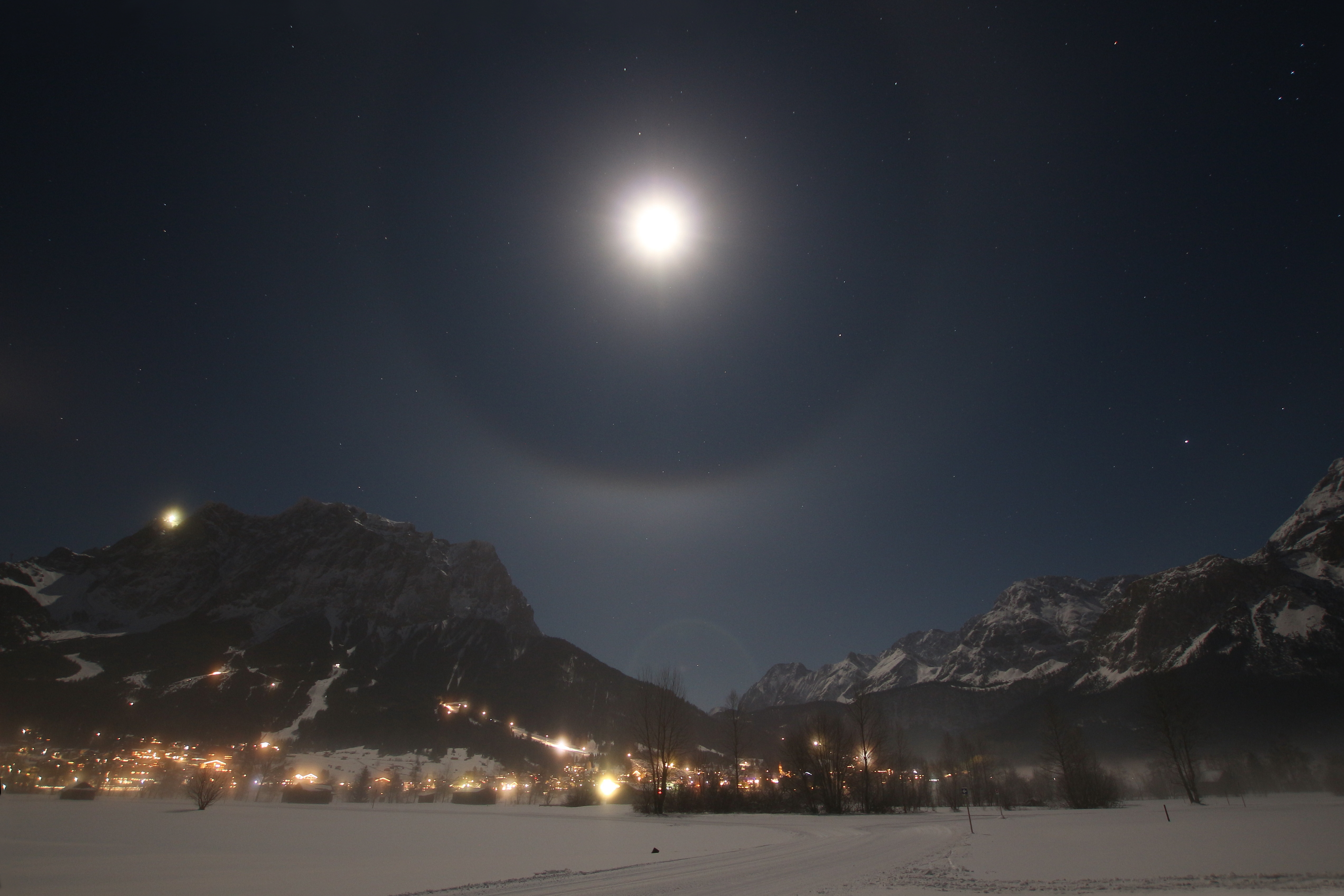 Auf dem Weg zu einem Winterwochenende nach Mittenwald machte ich einen kurzen Stopp bei Ehrwald in Tirol und konnte einen schönen Halo um den Vollmond über der Zugspitze sehen. Während ich die vom Mondlicht beleuchtete Winterlandschaft fotografierte, verformte sich der kreisrunde Halo oval und verschwand schließlich.