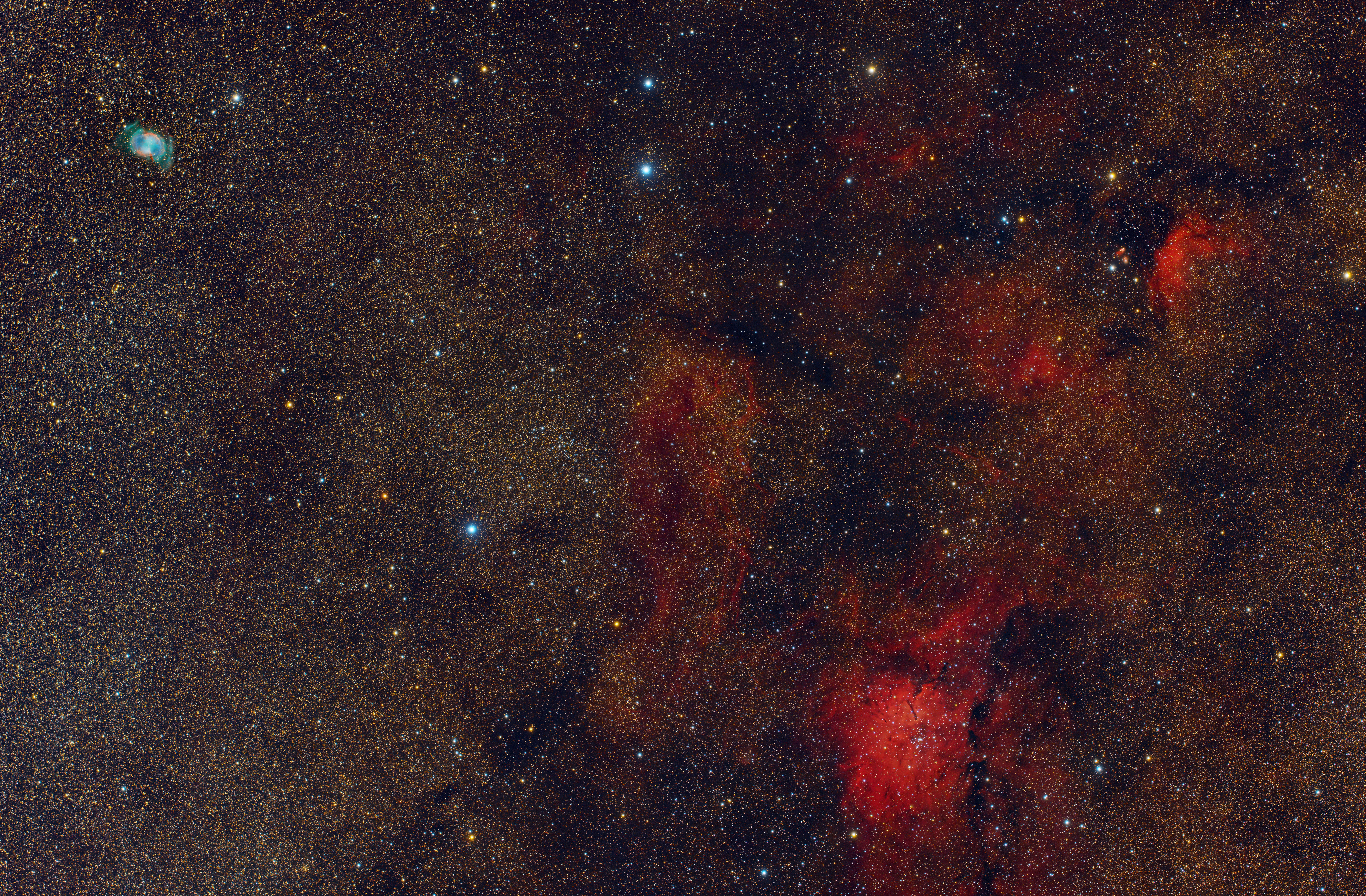 Dieses Bild entstand am 22. und 23. August 2022 aus einer RGB- und aus einer Dualband-Aufnahme. Man sieht sehr gut, in was für einer Gegend sich der Hantelnebel in der Milchstraße befindet. Oben links ist der Hantelnebel M 27, unten rechts der Sternhaufen NGC 6830 mit der dazugehörigen HII-Region NGC 6820.