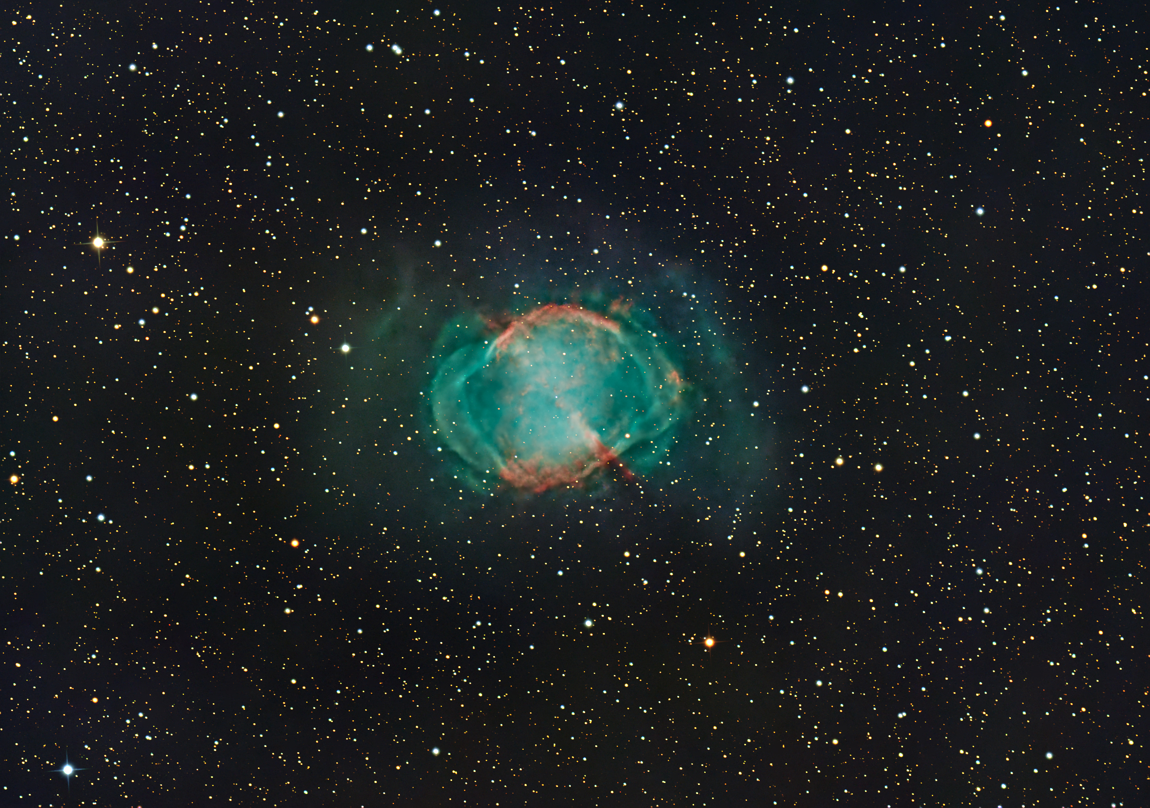 Der Hantelnebel ist ein rund 1300 Lichtjahre entfernter heller Planetarischer Nebel im Sternbild Fuchs. Der Nebel ist vor ungefähr 10000 Jahren durch einen Roten Riesenstern, dem in seiner Endphase der nukleare Brennstoff im Kern ausgegangen ist, entstanden. Der Stern hat sich aufgebläht und anschließend seine Hülle abgestoßenen. Diese Hülle dehnt sich kontinuierlich mit einer Geschwindigkeit von circa 30 km pro Sekunde aus. Innerhalb dieser Hülle blieb ein Zentralstern, ein sogenannter Weißer Zwerg, übrig. Die ultraviolette Strahlung dieses kleinen Sterns regt die abgestoßenen Gase zum Leuchten an, wodurch die Nebelstruktur sichtbar wird. Gesamtbelichtungszeit drei Stunden