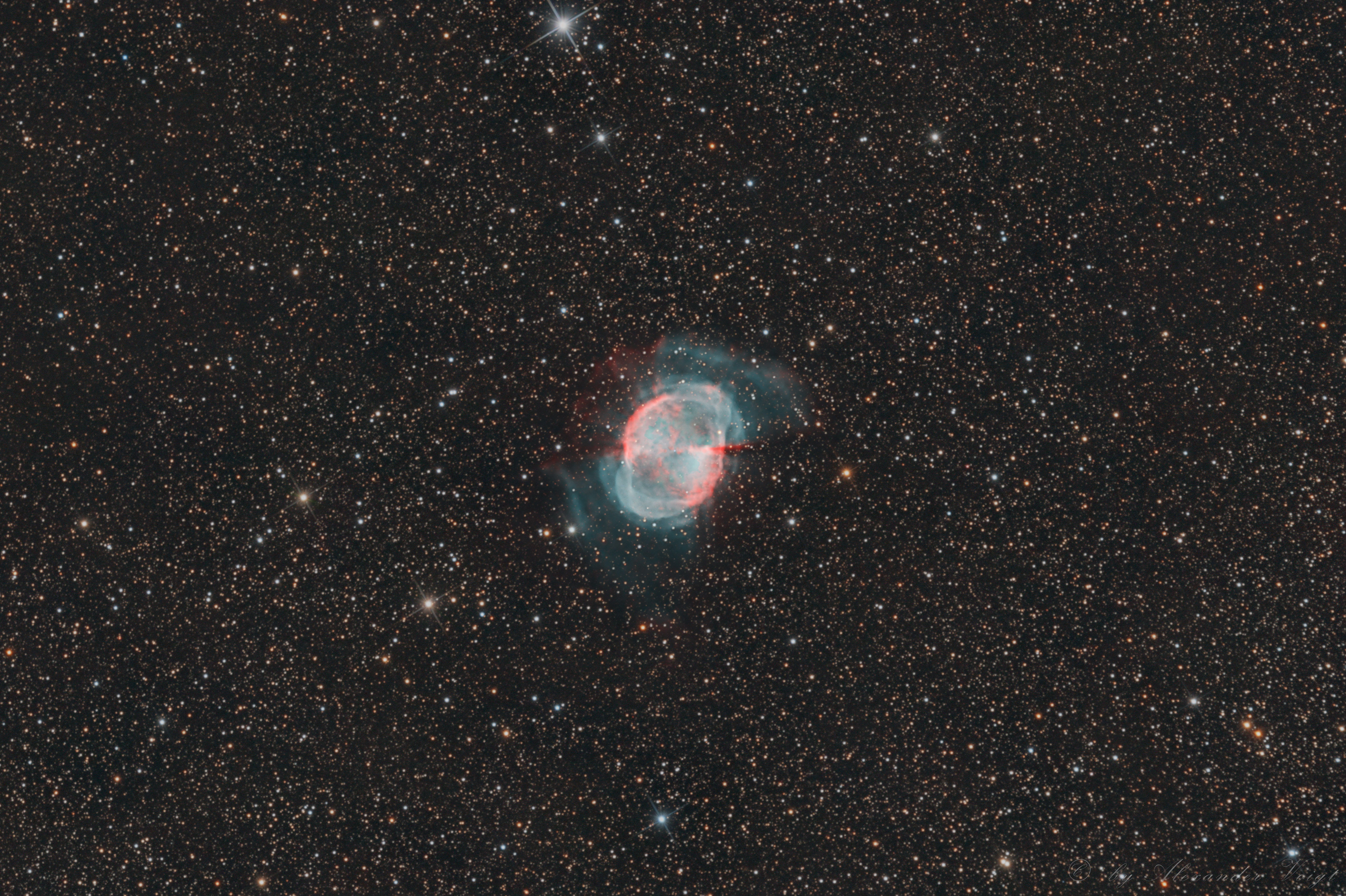 Da ja die letzten Tage und Nächte unglaublich schön waren, hab ich das Teleskop auf M27 gehalten. Zusammen gekommen sind 15,5 Stunden in H-alpha, OIII und LRGB.